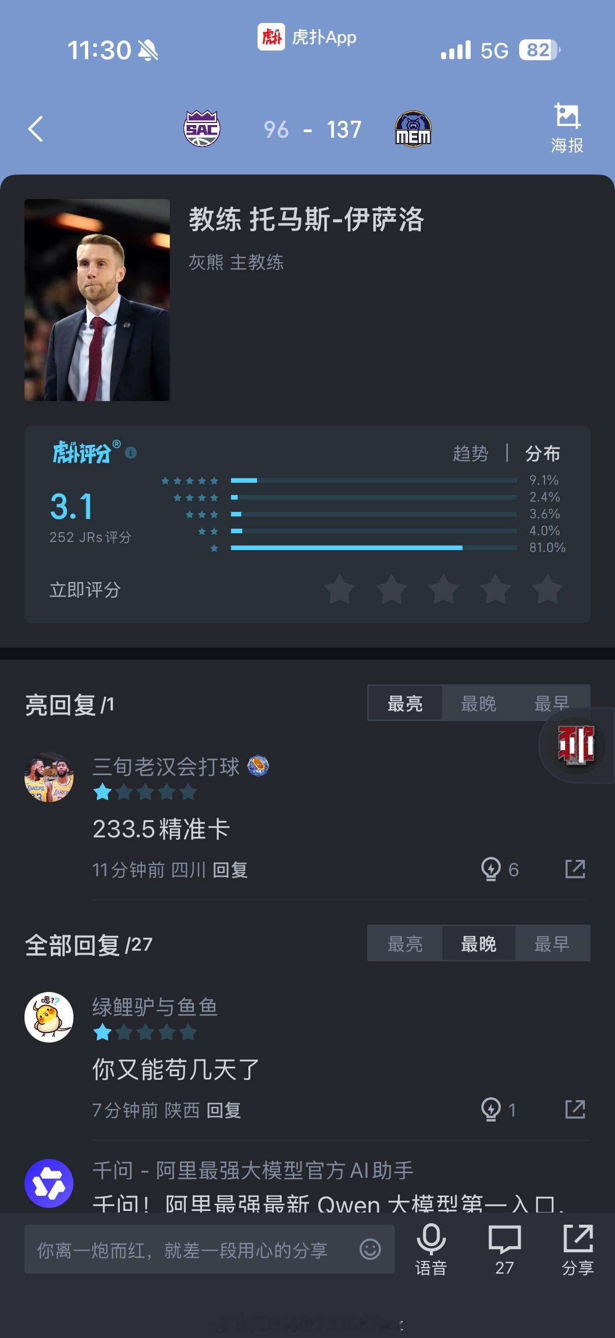 灰熊赢41分又怎样?你评分也只能3.1…暂且让你苟两天!