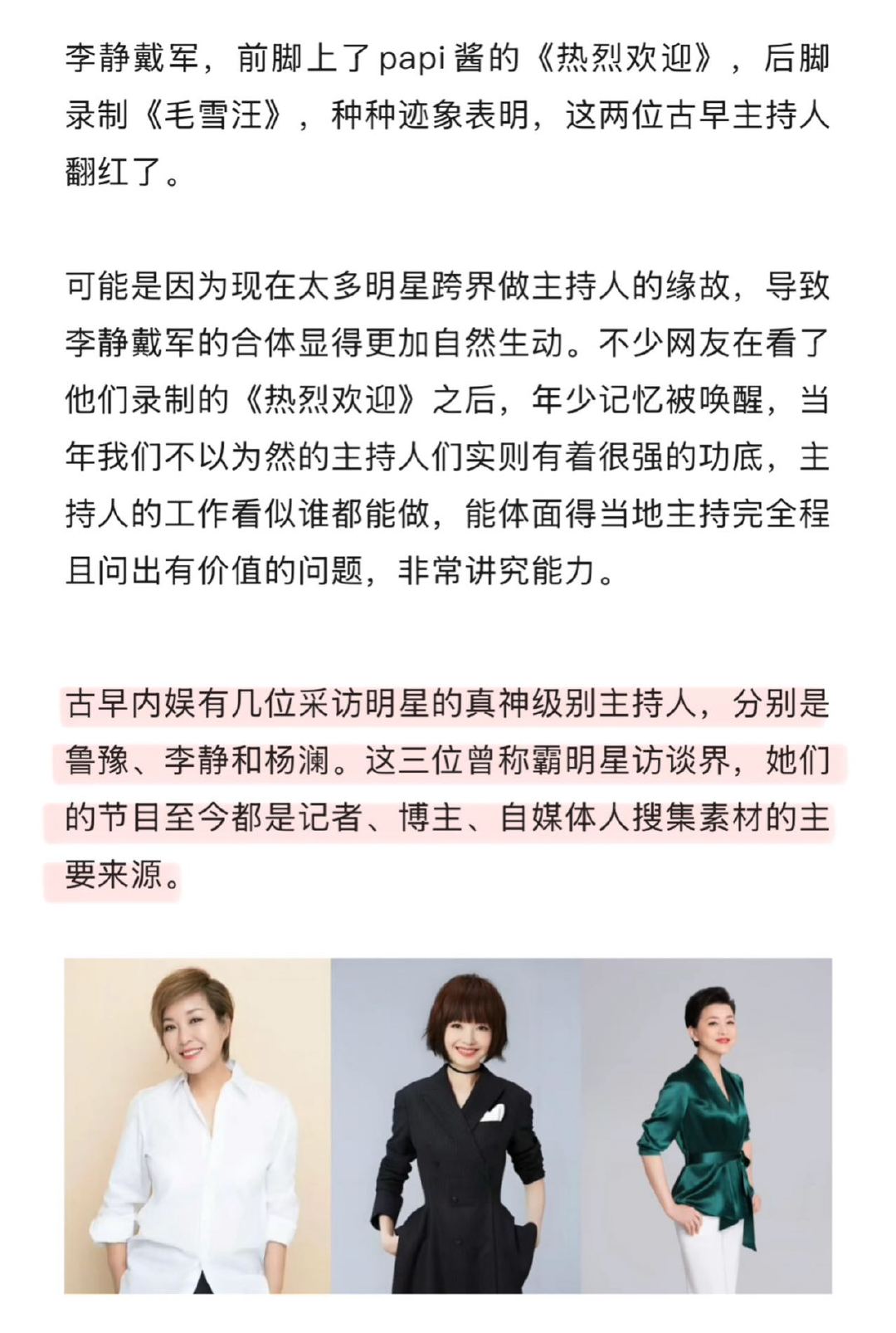 李静戴军翻红、鲁豫备受年轻人追捧,古早主持人纷纷翻红。《鲁豫有约》《非常静距离》《超级访问》……众多80、90后对于明星访谈的记忆是从这些节目开始的吧~