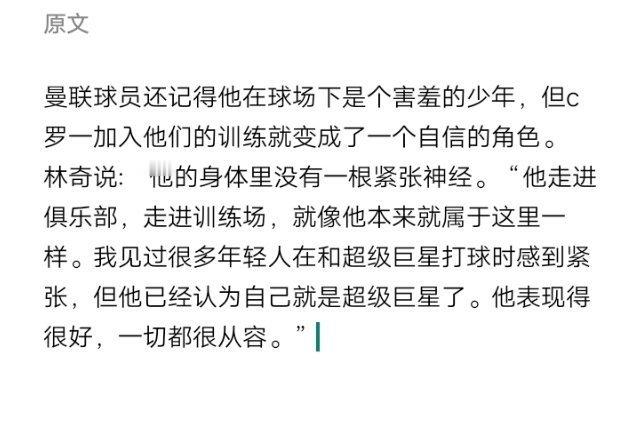 “很多年轻人在超巨身边踢球都会感到紧张,但他的身体里没有一根紧张神经,他走进这里,就好像他原本就属于这里一样,他表现很好,一切都很从容”~