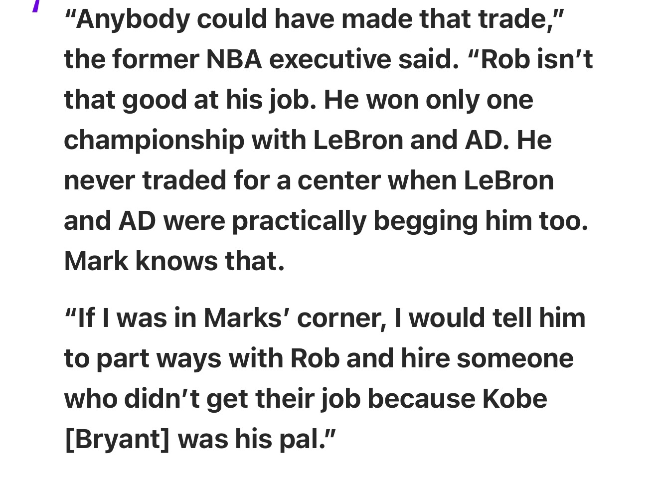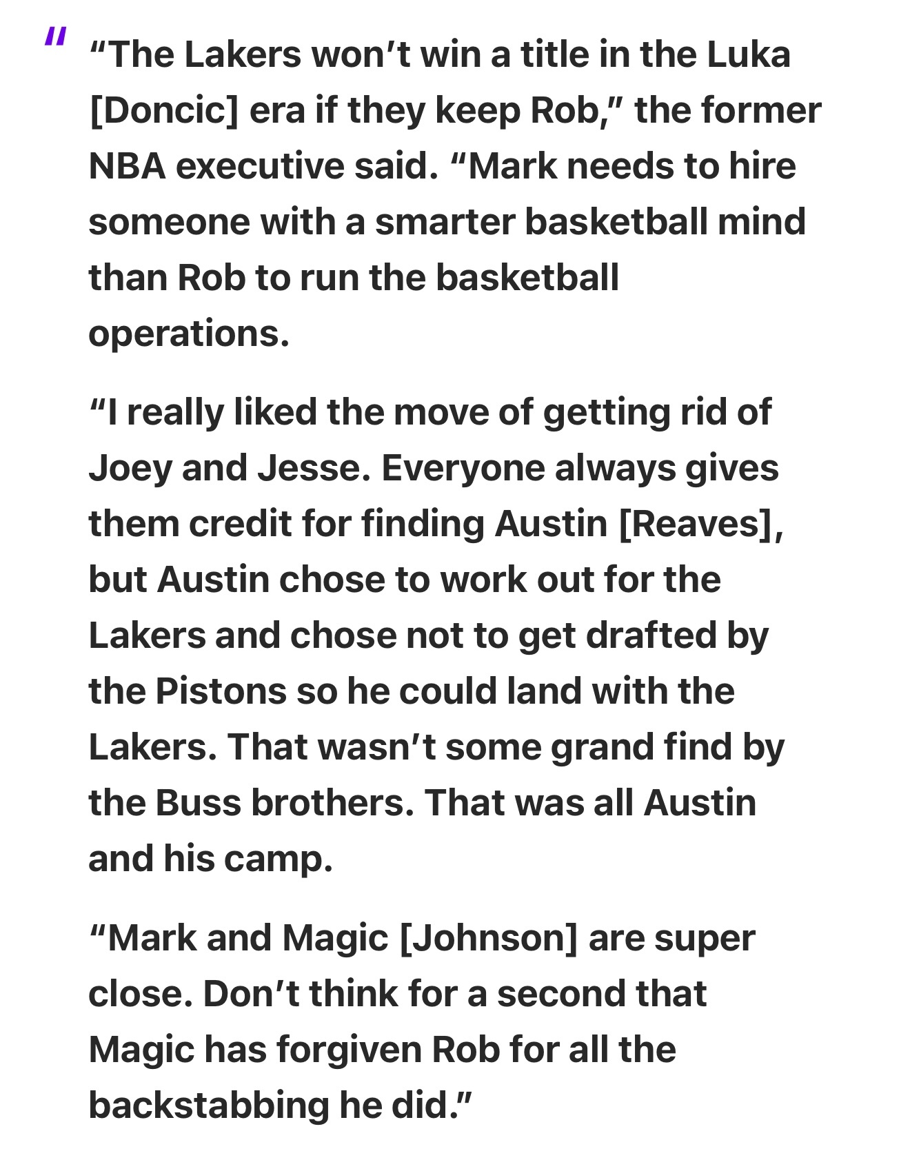 一名前NBA高管表示,湖人应该解雇佩林卡。“如果湖人队继续留用罗伯(佩林卡),他们在卢卡时代将无法赢得总冠军,马克·沃尔特需要聘请比罗伯更懂篮球的人来执掌篮球运营部门。”“我非常赞同解雇乔伊·巴斯和杰西·巴斯的决定。所有人总是将发现奥斯汀(里夫斯)的功劳归于巴斯兄弟,但实际上是奥斯汀主动选择为湖人队试训,并拒绝被活塞队选中以便加盟湖人。这并非巴斯兄弟的慧眼识珠,而是奥斯汀及其团队的运作结果。”“马克和魔术师(约翰逊)关系极为密切。别以为魔术师已经原谅了罗伯当年的那些背后捅刀行为。”“任何人都能完成那笔交易,罗伯的工作能力并不出色。拥有勒布朗和AD这样的球员,他却只赢得了一次总冠军。当勒布朗和AD几乎是在恳求他交易来一名中锋时,他也始终没有行动。马克心里清楚这些情况。”“如果我是马克的智囊,我会建议他与罗伯分道扬镳,去聘请一个不是靠'科比·布莱恩特是他哥们儿'这层关系得到职位的人。”