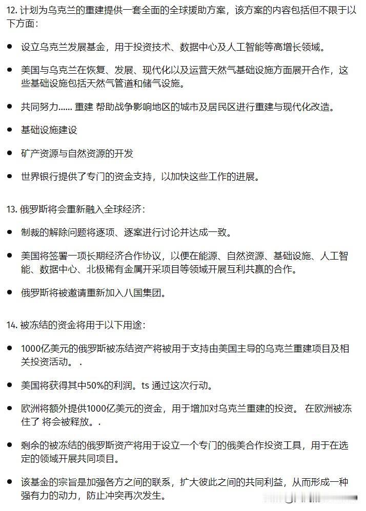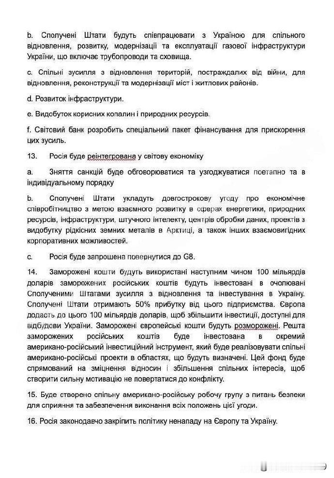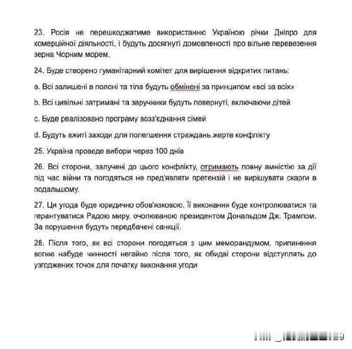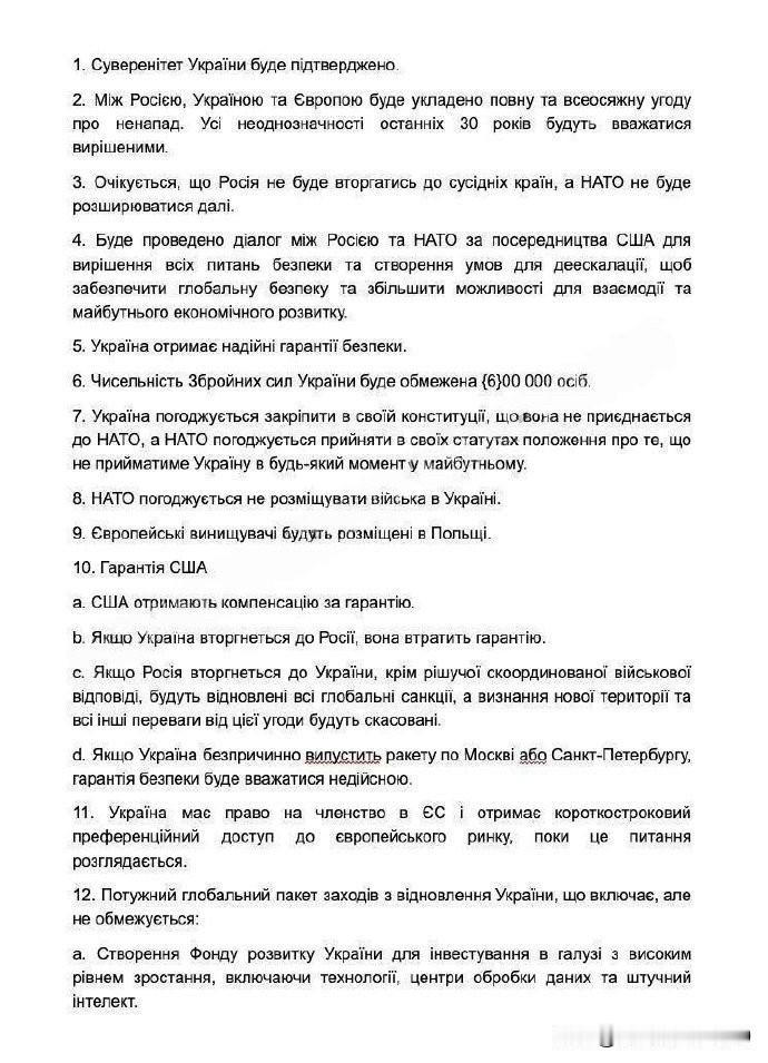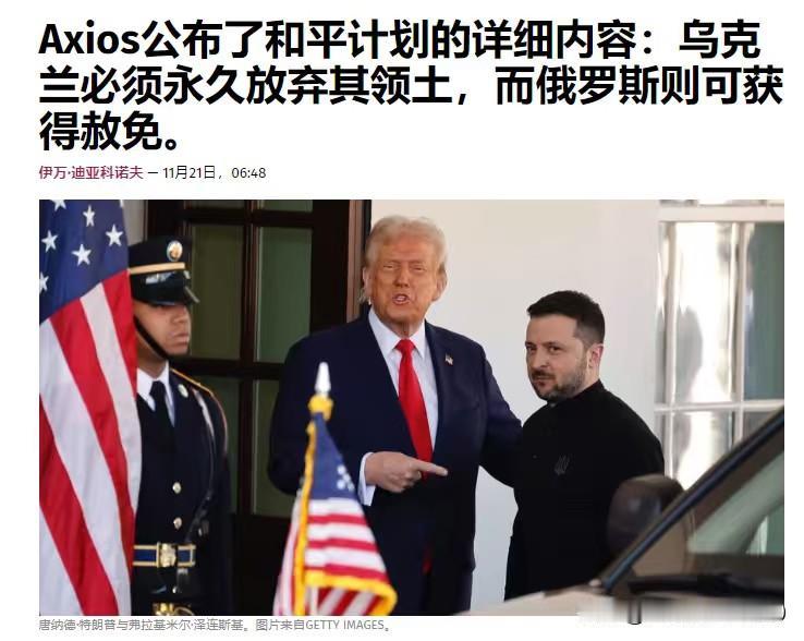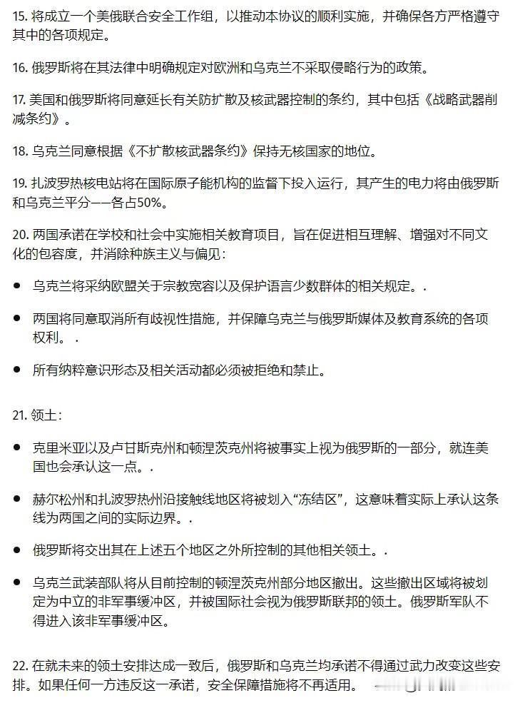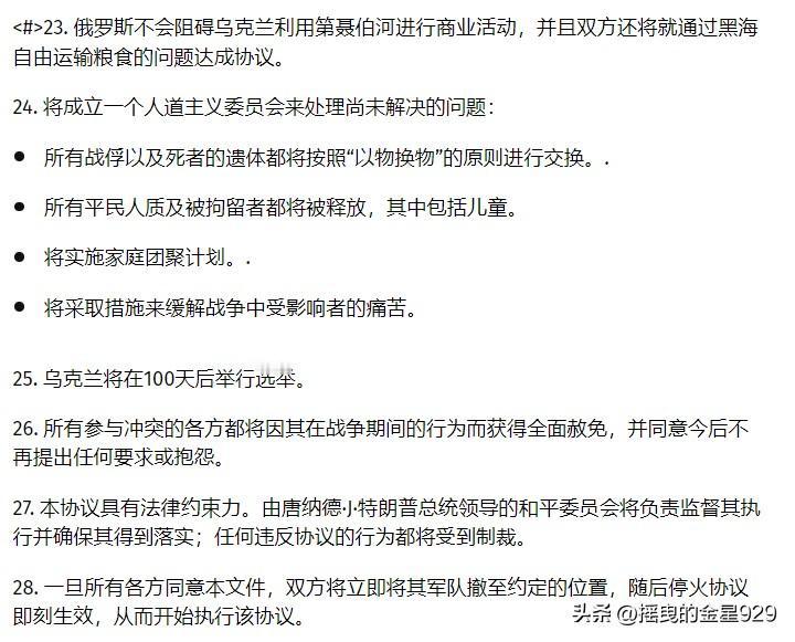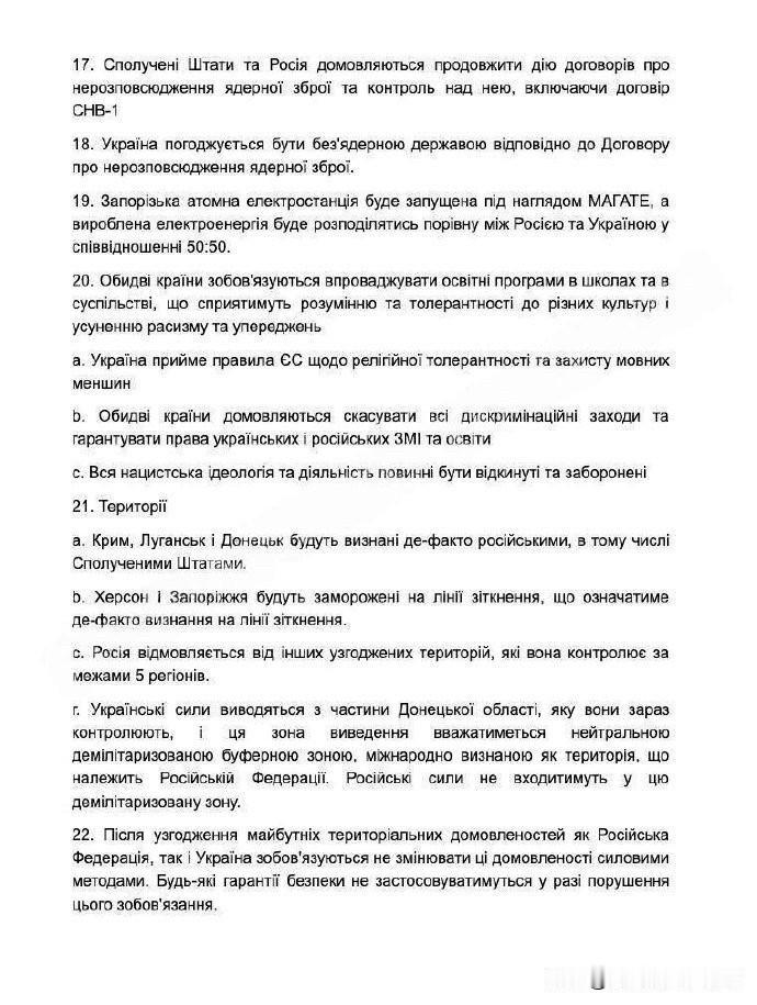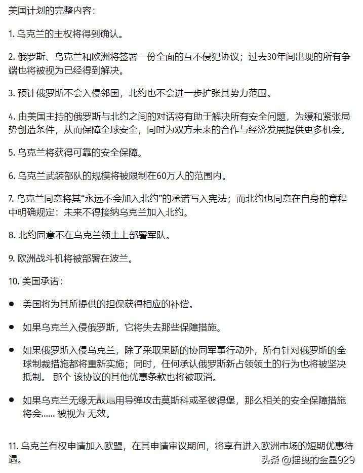 俄乌“28点和平计划”完整版协议曝光,乌克兰永久放弃加入北约,武装部队限制在60万以内,禁止部署远程武器,全面撤出顿涅茨克,国际社会法律承认克里米亚,顿涅茨克与卢甘斯克为俄罗斯领土,美国将承认——美国制定的“俄乌战争28点和平计划”条款曝光,并要求乌克兰在11月27日之前,必须接受条款协议。 据美国媒体援引其获得的草案文件以及乌克兰和美国官员的证实,报道了美国总统特朗普政府制定的这份包含28项内容的和平计划的具体内容。 根据该计划,乌克兰必须放弃部分领土,限制其武装力量的规模,并在宪法中明确规定永远不得加入“北大西洋公约组织” 该“28点和平计划”由特朗普的中东问题特使 威特科夫 起草,美国国务卿 卢比奥 以及特朗普的女婿 贾里德·库什纳 也参与了制定工作。 报道称,在准备过程中,威特科夫与俄罗斯总统普京的特使基里尔·德米特里耶夫进行了多次磋商。 德米特里耶夫表示,“他对这次尝试感到乐观。因为与之前的尝试不同,我们觉得俄罗斯的意见终于得到了重视”。 美国方面还与乌克兰国家安全与国防委员会秘书乌米耶罗夫(乌克兰前国防部长)进行了讨论。 报道称,美国陆军部长丹·德里斯科尔昨日抵达乌克兰首都基辅,并将这份“书面计划”交给了乌克兰总统泽连斯基。泽连斯基称这份文件代表的是美国的立场与设想,而非最终达成的协议,并强调其中存在“红线”。 报道称,该文件提议对乌克兰的地缘政治地位及领土完整进行重大调整。克里米亚以及顿涅茨克州和卢甘斯克州将在“事实上”被视为俄罗斯的领土,就连美国也会承认这一点。 赫尔松州和扎波罗热州的安全局势将沿接触线保持稳定。乌克兰武装部队需要从目前控制的顿涅茨克州地区完全撤出,届时这些地区将设立中立的非军事缓冲区。 美国白宫新闻发言人莱维特在昨晚的例行新闻发布会上也证实,美国国务卿鲁比奥与美国中东问题特使威特克夫一直幕后悄悄在为乌克兰制定“和平计划”而努力。 莱维特说:“他们一直在与俄罗斯和乌克兰双方进行沟通,试图了解它们各自会做出哪些承诺,从而实现持久和平。这对俄罗斯和乌克兰来说都是一个不错的方案;我们相信双方都会接受这个方案,因此我们正在全力以赴地推动其落实。” 与此同时,据《金融时报》报道,美国还向乌克兰施加了巨大压力,特朗普政府设定了 “非常严格”的 最后期限,要求乌克兰在感恩节前(11月27日)同意这份“28点和平计划”的相关协议条款,并在12月初完成整个谈判进程。 美国计划的28点完整版内容如下。