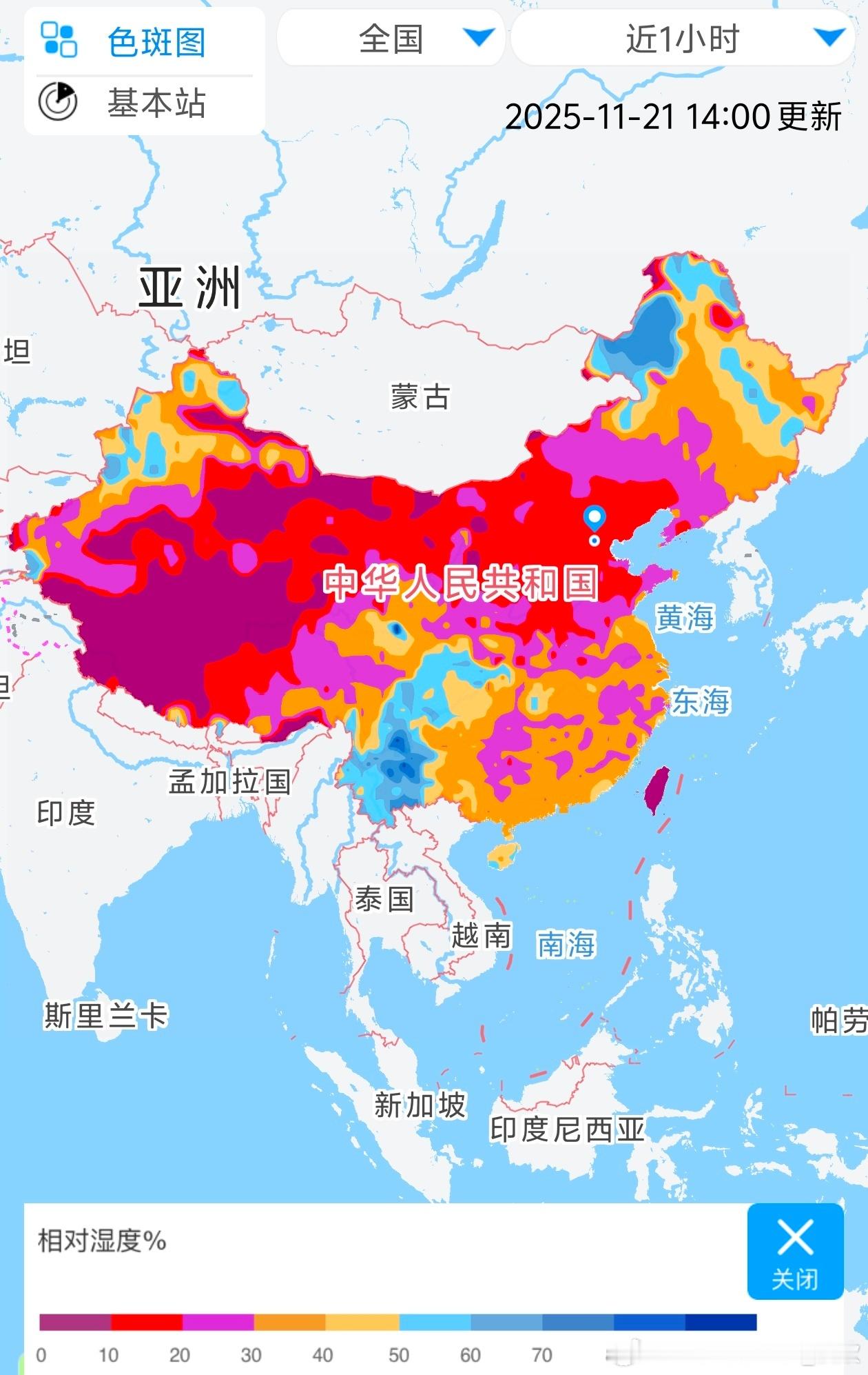 【干燥】今天下午,我国大部地区依然干燥。14时,北方多地相对湿度不足20%,比如郑州11%,石家庄13%,北京14%,天津西青17%,济南17%,太原老站(53772)17%、银川16%。南方部分地区,湿度也很低,比湖北神农架17%、福建龙岩18%、广西桂林18%、江苏南京20%、福建武夷山23%、江西萍乡29%、广东新会29%。