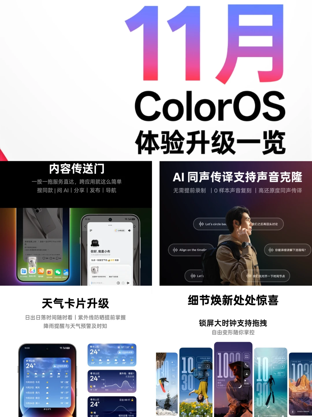 11月份的ColorOS 16升级体验计划公布了,更新内容包括AI、系统与桌面、天气、小布建议、通信优化,新功能和优化还是挺多的,我来总结一下重点吧~