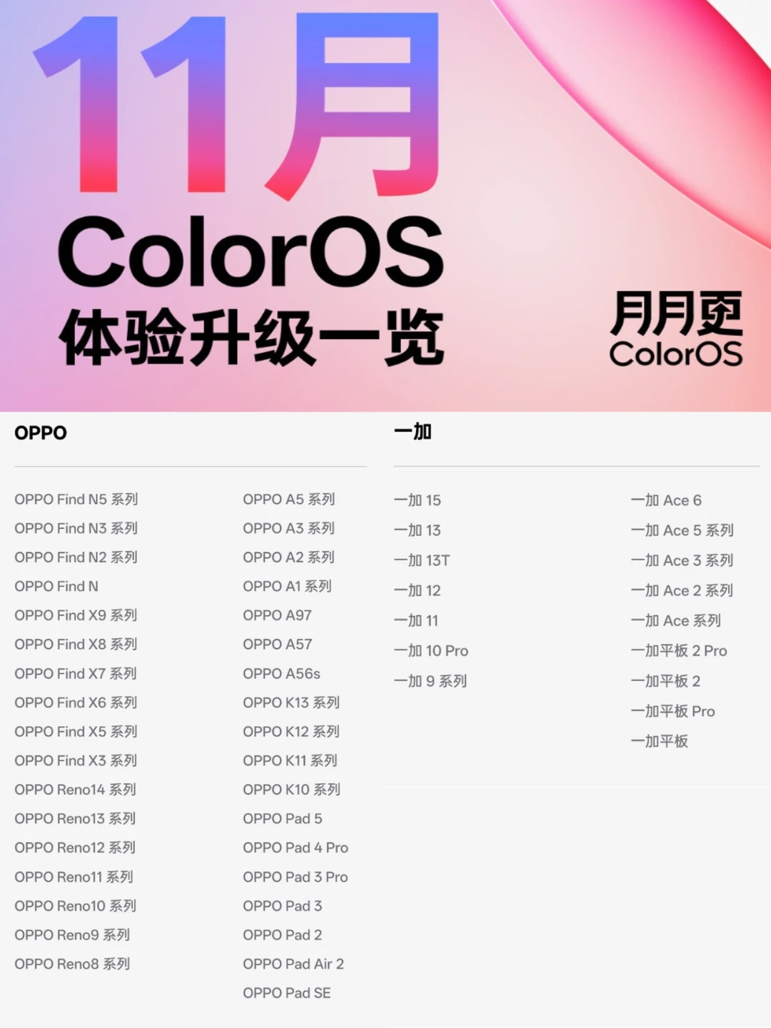 让我意外的是,除了Find X9系列,11月的升级体验竟然覆盖了100+款手机,像Reno8系列、以及一加9系列这些几年前的老机子都能更新,只能说OPPO良心了,不愧是机圈掌握系统更新的神!