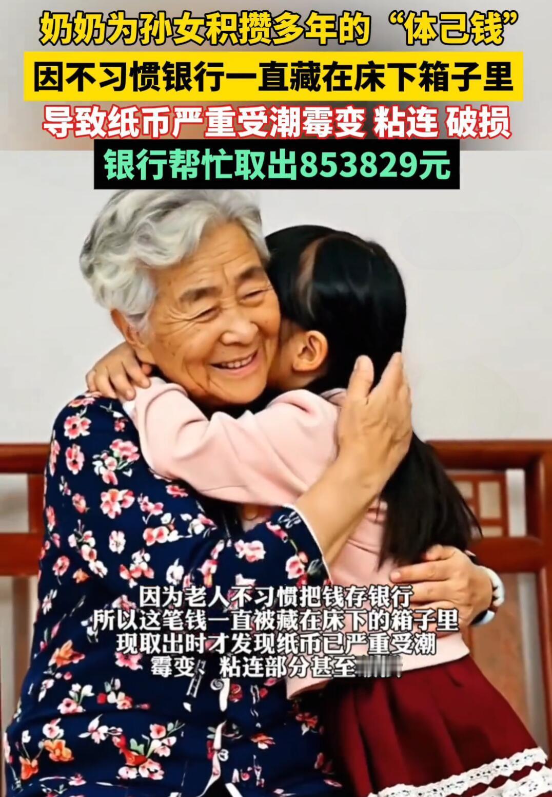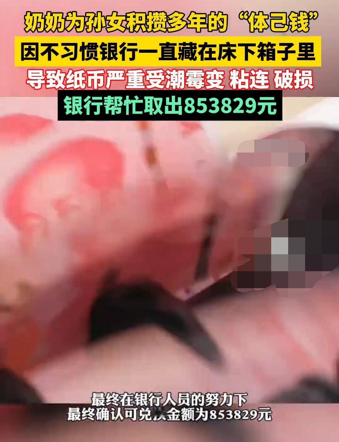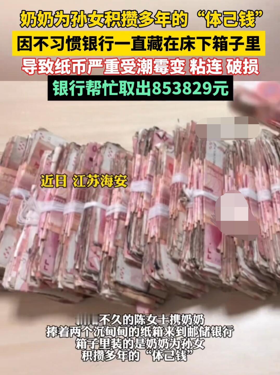 看到江苏海安这个事,真是又暖心又心疼。 有个奶奶给孙女攒了多年的陪嫁钱,整整八十多万,因为不放心存银行,就偷偷藏在床底箱子里。结果时间久了,纸币受潮发霉,全部粘在一起,边角都烂了,一碰就碎。老人急得直掉眼泪——这哪是钱啊,是她省吃俭用一点一点攒下来的心意。 孙女陈女士陪着奶奶把两大箱残币抱到邮储银行,工作人员二话不说开了绿色通道。一群人蹲在地上像修复文物一样,用镊子轻轻剥离,软布慢慢擦拭,对照残损币兑换标准一张张核对。忙活了整整六个小时,最后成功兑换了85万3829元,几乎没损失。 看着奶奶攥着新钞票笑得合不拢嘴,孙女说突然明白了,这些钱里装的全是奶奶沉甸甸的偏爱。 其实类似新闻真不少,老人把现金藏家里,不是受潮就是被虫蛀,还有被老鼠咬的。真心劝各位长辈,别再把钱藏家里了,床底灶台都不安全。存银行既保险又省心,还能让这份心意完好地传递下去。 说到底,这份藏在床底发霉的钱,霉掉的是纸币,霉不掉的却是奶奶那份最朴实的疼爱。