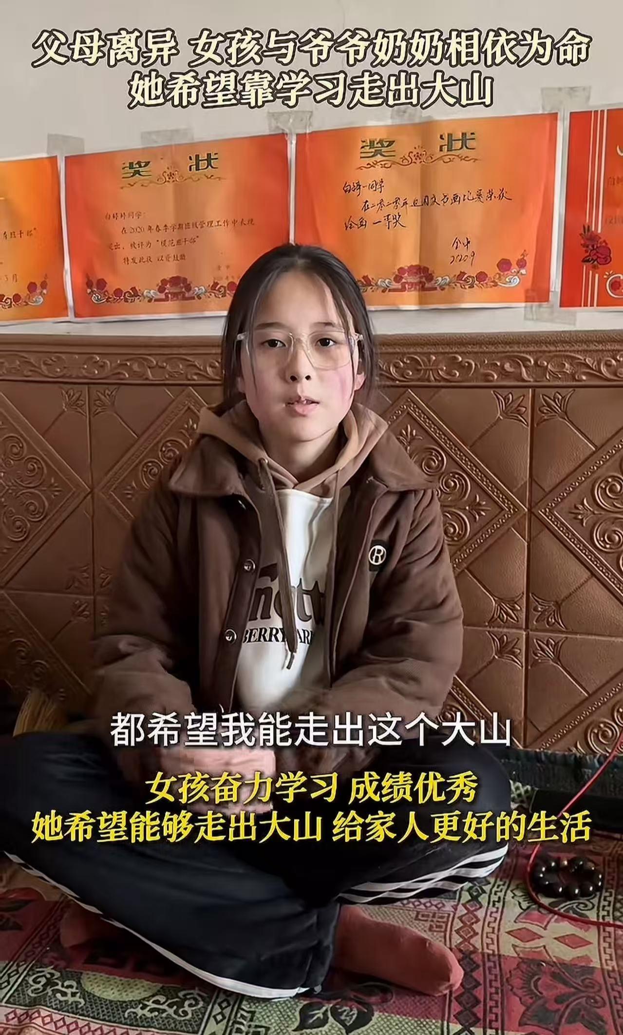 看哭了!父母离异,女孩与爷爷奶奶相依为命,这天志愿者来她家里进行帮扶,看到女孩吃一锅不知放了多久的腌菜,忍不住问她为什么不吃肉?女孩说:“因为肉太贵了,我们平时能吃上腌菜就很不错了!” 女孩出生在一个偏远的小山村里,在女孩还小的时候,妈妈就狠心地和她爸爸离了婚,然后头也不回地离开了,从此再也没回来过。 爸爸为了撑起这个家,让女孩能过上稍微好一点的生活,只能背井离乡,外出打工挣钱。 从那以后,女孩就只能和年迈的爷爷奶奶相依为命,日子过得紧巴巴的。 这天,一群志愿者来到了女孩的家里,想要给他们提供一些帮扶。 当志愿者走进家门,看到眼前的景象,心里一阵酸涩。 只见女孩和爷爷正坐在桌前,手里拿着白馒头,就着一盘不知道放了多久、颜色都有些黯淡的腌菜,吃得十分艰难。 志愿者实在忍不住,轻声问女孩:“小朋友,你怎么不吃肉呀?” 女孩抬起头,脸上带着与她年龄不符的懂事和无奈,轻声说道:“因为肉太贵了,我们平时能吃上腌菜就已经很不错啦。” 原来,女孩早就习惯了没有肉的日子。她心里清楚家里的经济状况,明白每一分钱都来之不易。所以,哪怕白馒头再难以下咽,她也从不挑剔,总是默默地咽下去。 志愿者环顾四周,发现这个家里几乎没有一件像样的家具和工具,破旧又简陋,但却被收拾得干干净净、井井有条。 爷爷感慨地说:“这孩子可懂事了,每天放学回来,都会主动帮忙干农活,扫地、擦桌子,把家里收拾得妥妥当当的。” 志愿者看着女孩,心中满是心疼,便轻声问她:“小朋友,要是你妈妈现在站在你面前,你最想对她说些什么呀?” 女孩的眼神瞬间黯淡下来,眼眶里闪烁着泪花,她哽咽着说:“我想对她说,要是你不要离开我,那我们一家人在一起该有多幸福啊。” 说着说着,女孩再也控制不住自己的情绪,泪水夺眶而出。她心中对母爱的渴望,就像决堤的洪水,化作脸颊上滚烫的泪珠,不停地滑落。 后来,志愿者又注意到女孩房间的墙上贴满了奖状,便好奇地问:“我看你的奖状特别多,你成绩肯定特别优秀,那你这么努力学习是为了什么呀?” 女孩擦了擦眼泪,眼神中透露出坚定和憧憬,大声说道:“我希望能够走出这座大山,去外面的世界看看,然后努力挣钱,给爷爷奶奶和爸爸更好的生活!” 虽然生活如此困难,但女孩没有被生活的苦难打倒,反而用稚嫩的肩膀扛起了家庭的重担,用坚强和懂事诠释着亲情的力量。 那些抛弃家庭、只图自己安逸的人,真应该好好看看这个女孩,看看什么才是真正的责任和担当,什么才是值得珍惜的亲情! 这个女孩,未来一定会凭借自己的努力,走出大山,实现自己的梦想,而她身上的这份坚韧和善良,也必将照亮她前行的道路!