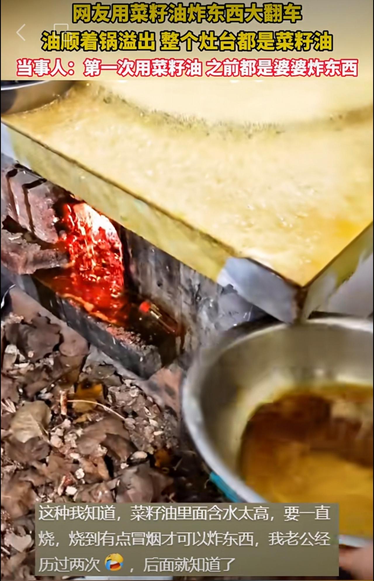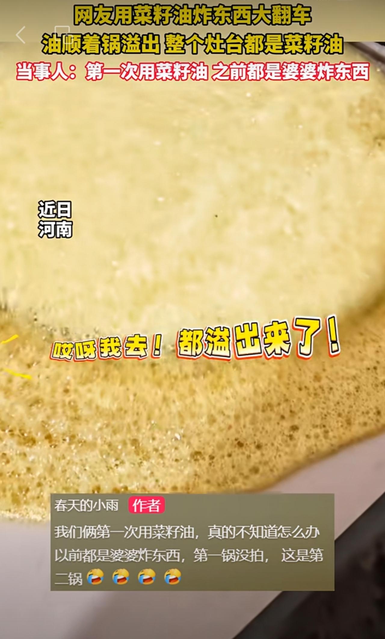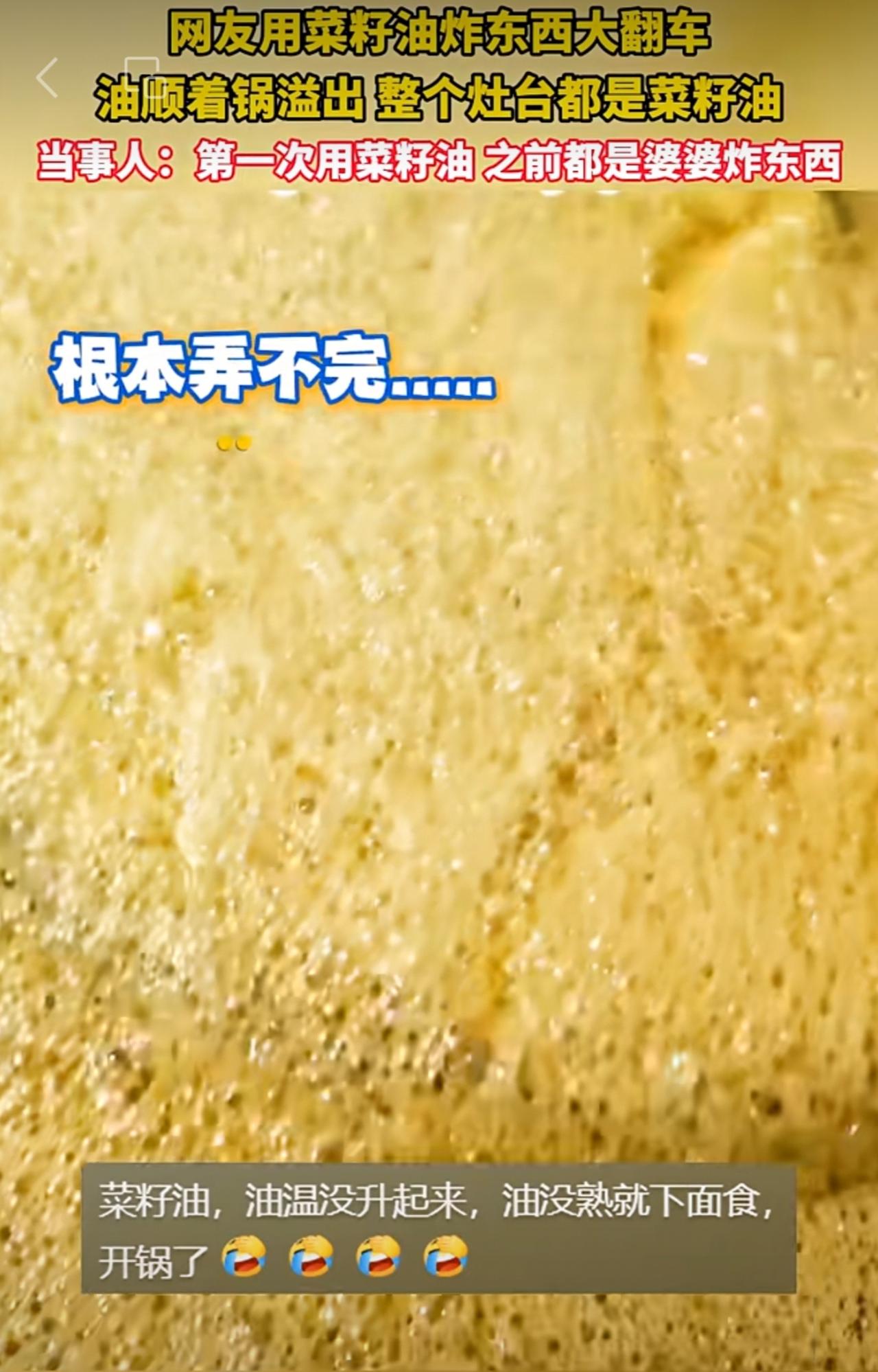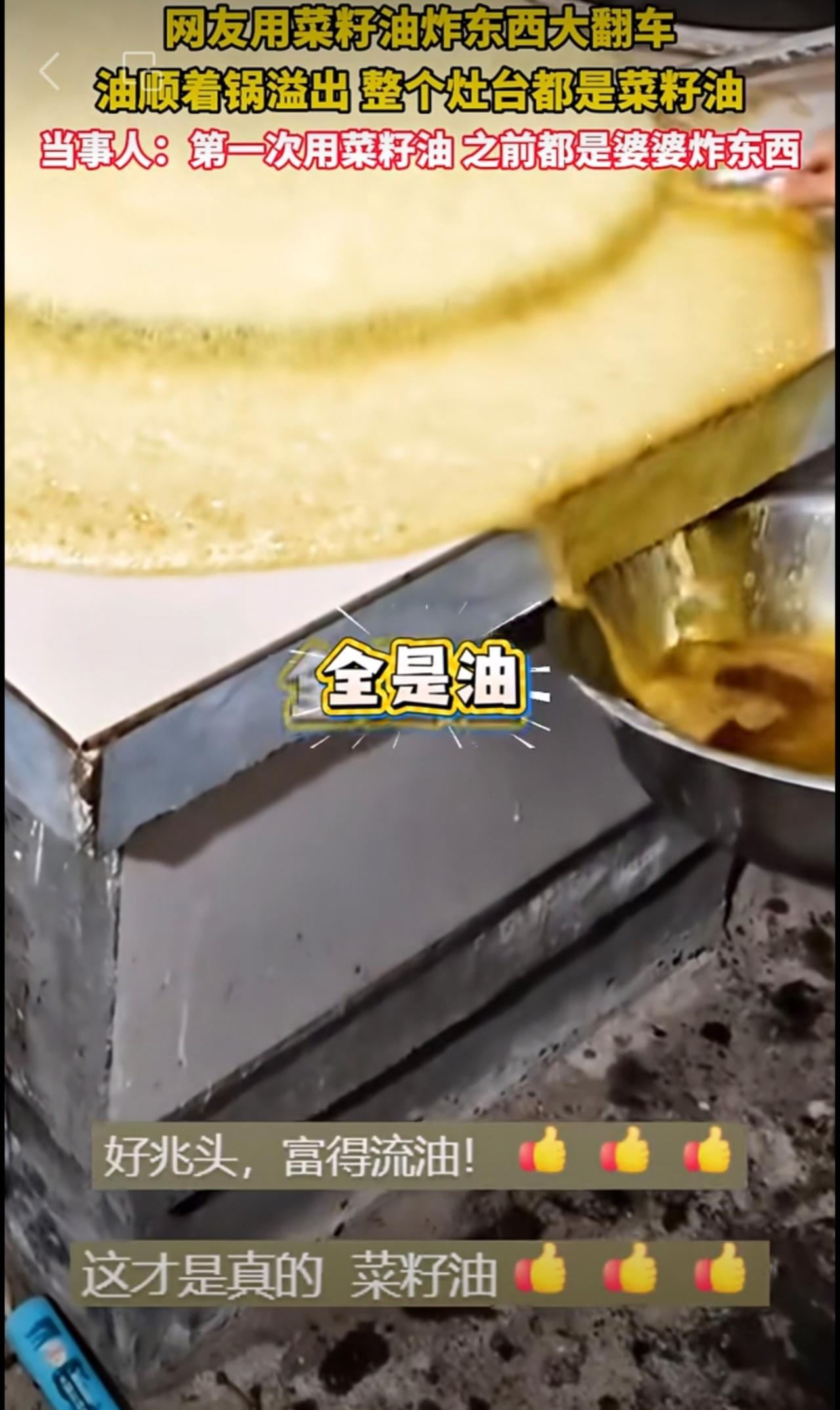 网友用菜籽油炸东西把握不住,油顺着锅溢出,导致整个灶头都是菜籽油。网友惊呼:真·现实版富得流油!
