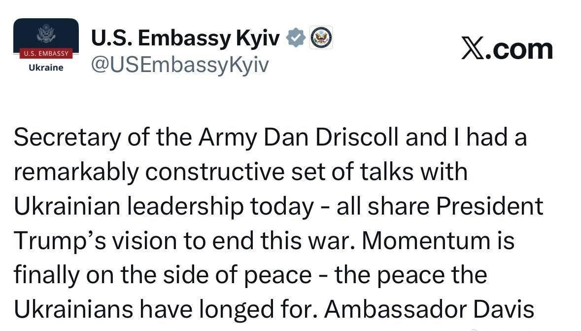 美國臨時代辦Julie S. Davis說:「最終,局勢正朝著烏克蘭人民期盼已久的和平發展。」 「我們今天與烏克蘭領導人進行了極具建設性的會談——大家都認同川普總統結束這場戰爭的願景,」這位外交官在澤連斯基和Driscoll會晤後表示。