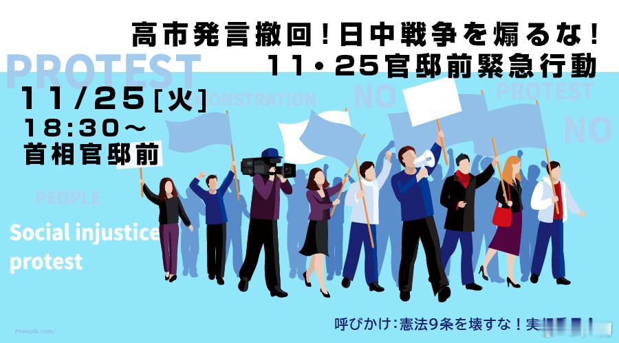 日本和平团体宣布将在11月25日在首相官邸前举行“高市收回言论!停止煽动日中战争!紧急行动” 游行,并号召日本爱好和平人士参加。