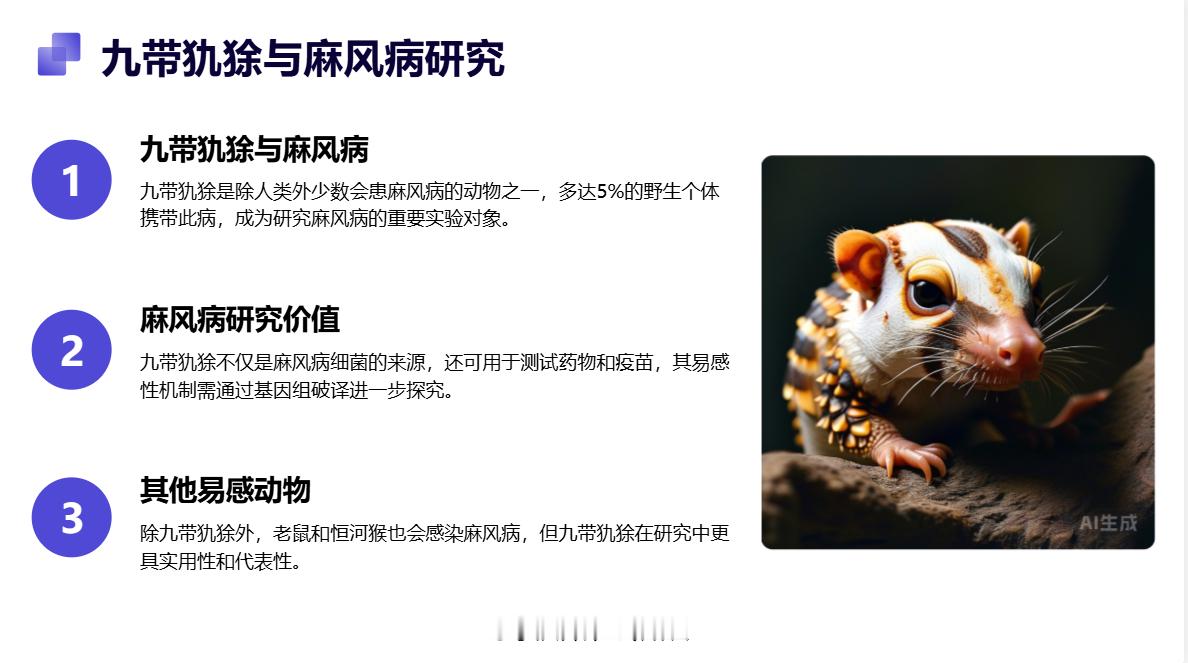 为什么九带犰狳会患麻风病?人们常说,九带犰狳是除人类以外唯一会患麻风病的动物。这其实并不正确,因为老鼠和恒河猴也会感染麻风病,但九带犰狳的确是对麻风病研究最有用的实验动物,因为多达5%的野生九带犰狳被认为患有这种疾病。因此,它们不仅是病源细菌的宝贵来源,而且也是测试可行性药物和疫苗的可靠实验对象。为什么人类和九带犰狳会进化出一样的麻风病易感性,这个问题可能要等破译了九带犰狳完整的基因组后才能知晓。||