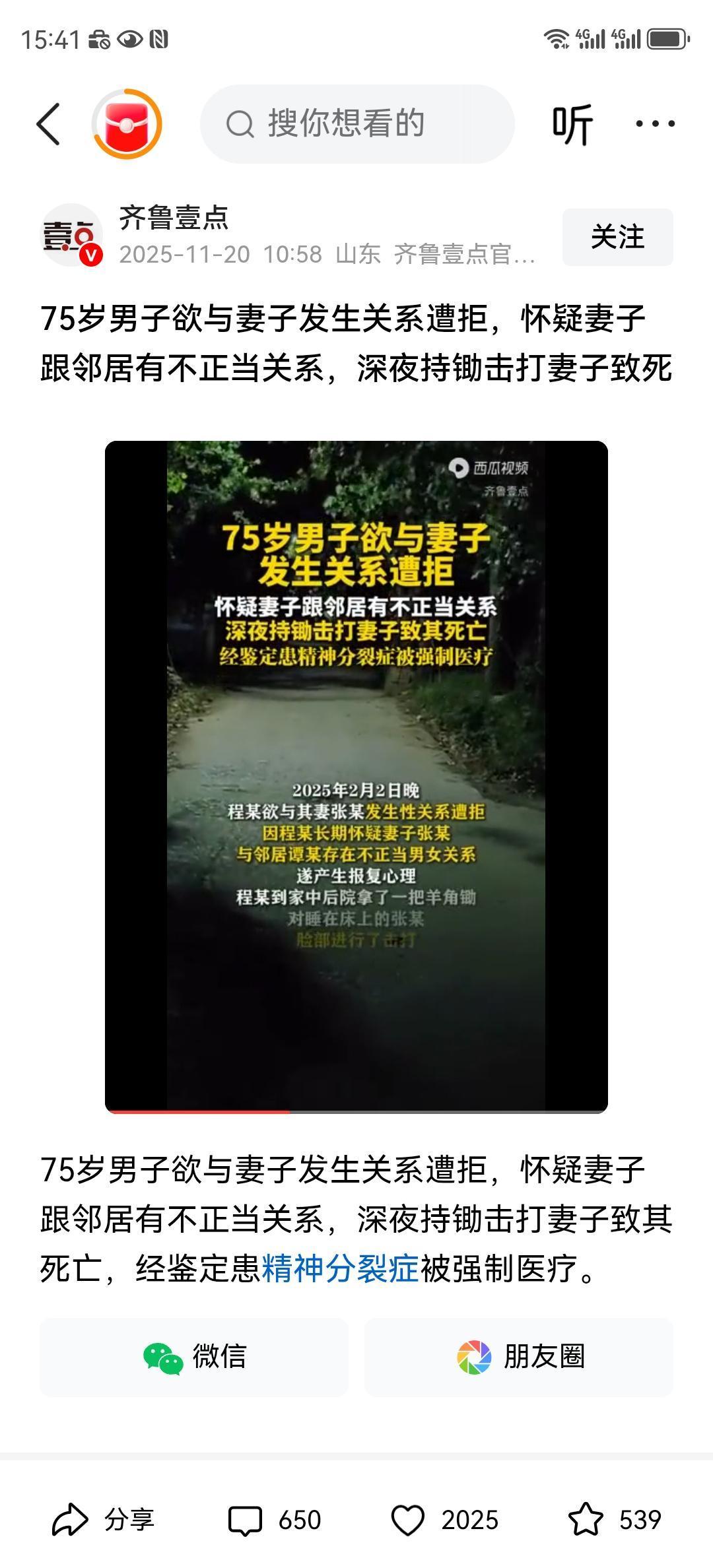 太不思议了,刚刚刷到一个视频,一男人75岁了,还要与妻子发生关系,被妻子拒绝后,他怀疑妻子与隔壁邻居有不正当的关系,于是用锄头打死了妻子。 有网友说自己老公40岁就稳的很,任你怎么搔首弄姿他就是不回应,看来不是所有的男人都一样。