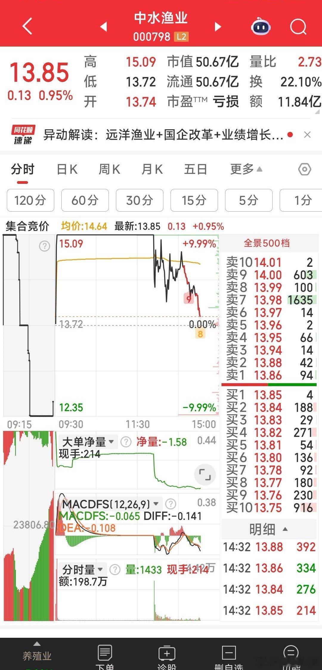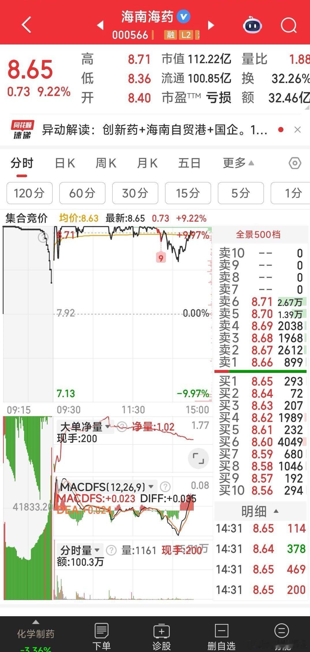 涨停15.09元出了中水渔业(因大单流出),8.7元又干了海南海药(因大单流入)