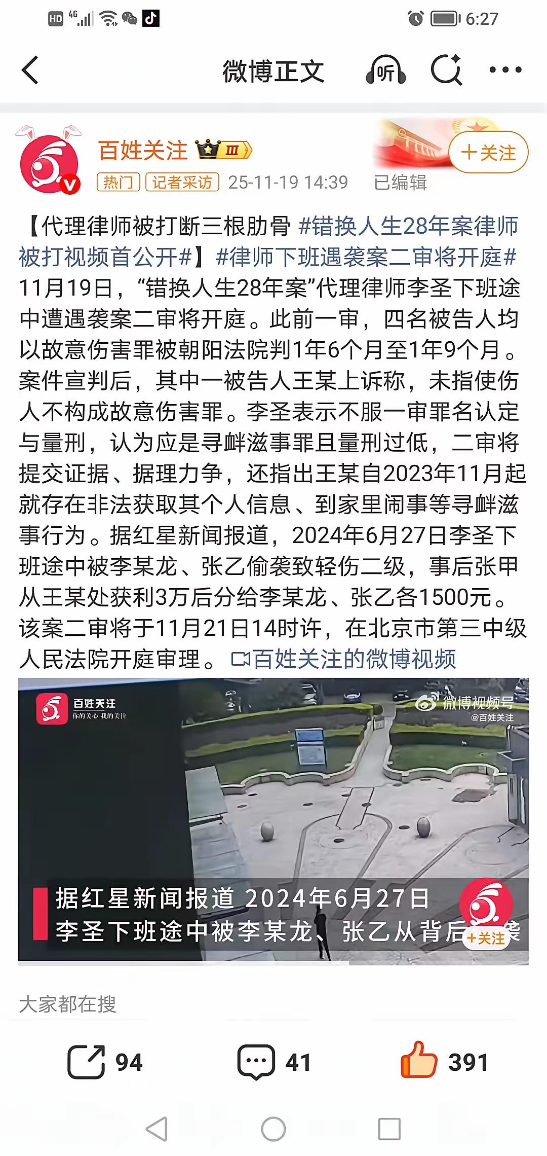 今天下午2时,李圣律师被王某晶团伙殴打事件二次K庭! 作为二八案的代理律师,李圣律师坚持为真相发声、为当事人维权。李圣律师被打,这不仅是打在李圣律师身上,更是打在每一位相信公平正义的普通百姓身上。 一个执F律师尚且遭遇如此e行,那普通百姓的维权困境又如何解? 大家都知道,律师是干啥的?就是帮人打官司、找真相、维护权益的,尤其是李圣律师这种盯着复杂案子的,本来就顶着不少压力。现在倒好,他只是坚持要个说法,居然还能被人动手打,这事儿听着就让人窝火。 二次开庭这事儿,本来是想把打人的理说清楚,给李律师一个公道。可反过来想,连帮人维权的律师都要遭这罪,咱普通老百姓要是遇上事儿,想找个地方说理,不得更难?你想想,要是连专业的法律人士都保护不了自己,那咱这些没那么多专业知识的人,遇到不公的时候,敢不敢站出来? 二八案这事儿闹了这么久,多少人都在等着看真相。李圣律师一直咬着不放,不就是想给当事人一个交代,也给关注这事儿的人一个明白。现在有人动手打他,明摆着就是不想让他把事儿查下去,不想让真相露出来。这可不是简单的打架,是想堵上说真话的嘴,断了维权的路。 咱常说要相信公平正义,可公平正义不是嘴上说说的。得是有人敢站出来,像李圣律师这样,哪怕遇到危险也不退缩;也得是不管是谁,不管有啥背景,只要做了违法的事,就得受惩罚。要是打人的团伙得不到应有的处理,那以后谁还敢替老百姓说话?谁还敢坚持要真相? 现在就盼着二次开庭能有个公正的结果,让动手的人付出代价,也让李圣律师能安心继续维权。这不仅是为了李律师一个人,更是为了咱所有相信“有理走遍天下”的普通人。要是连这点都做不到,那老百姓心里的那点盼头,可就真要凉了。 各位读者你们怎么看?欢迎在评论区讨论。