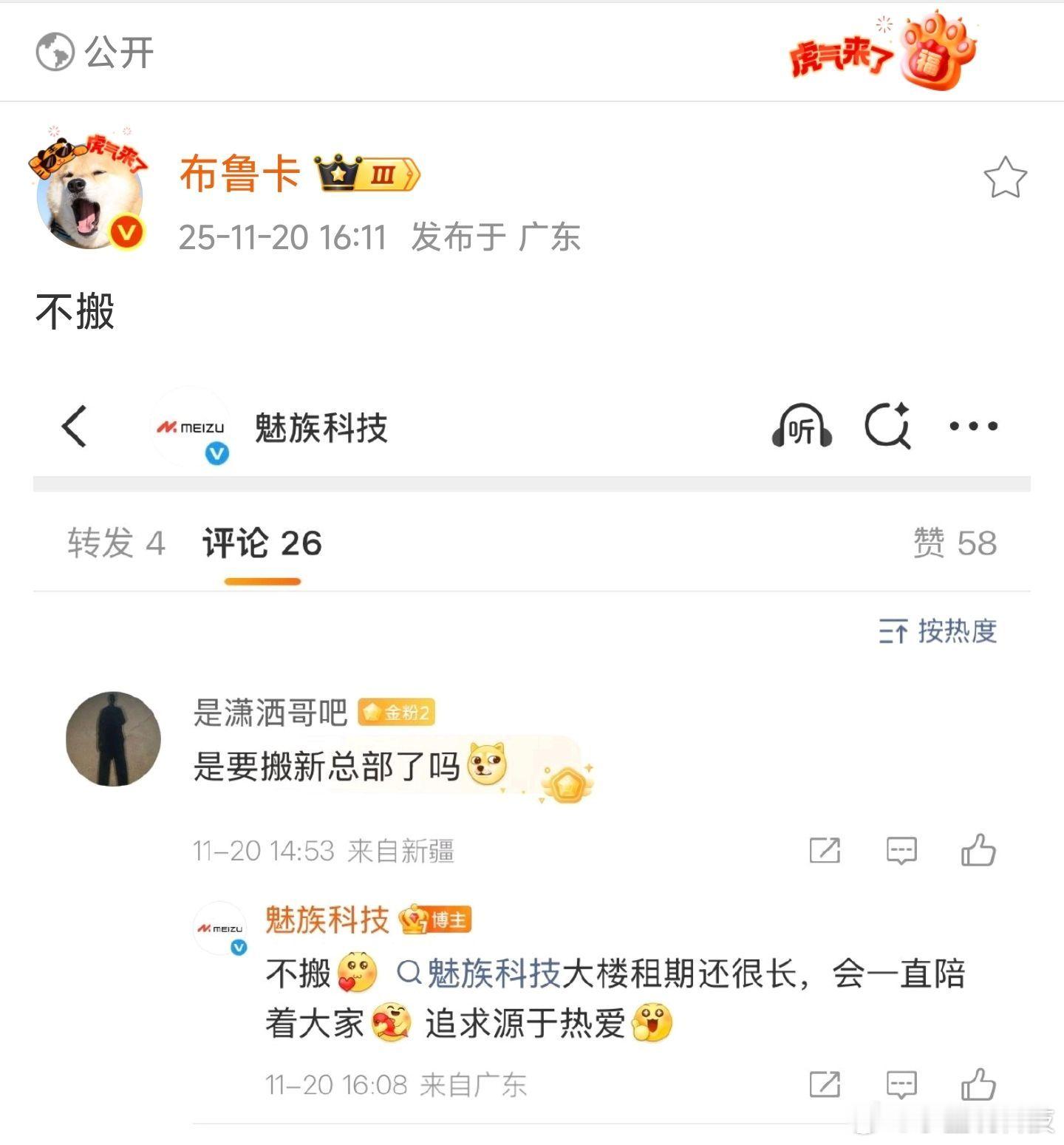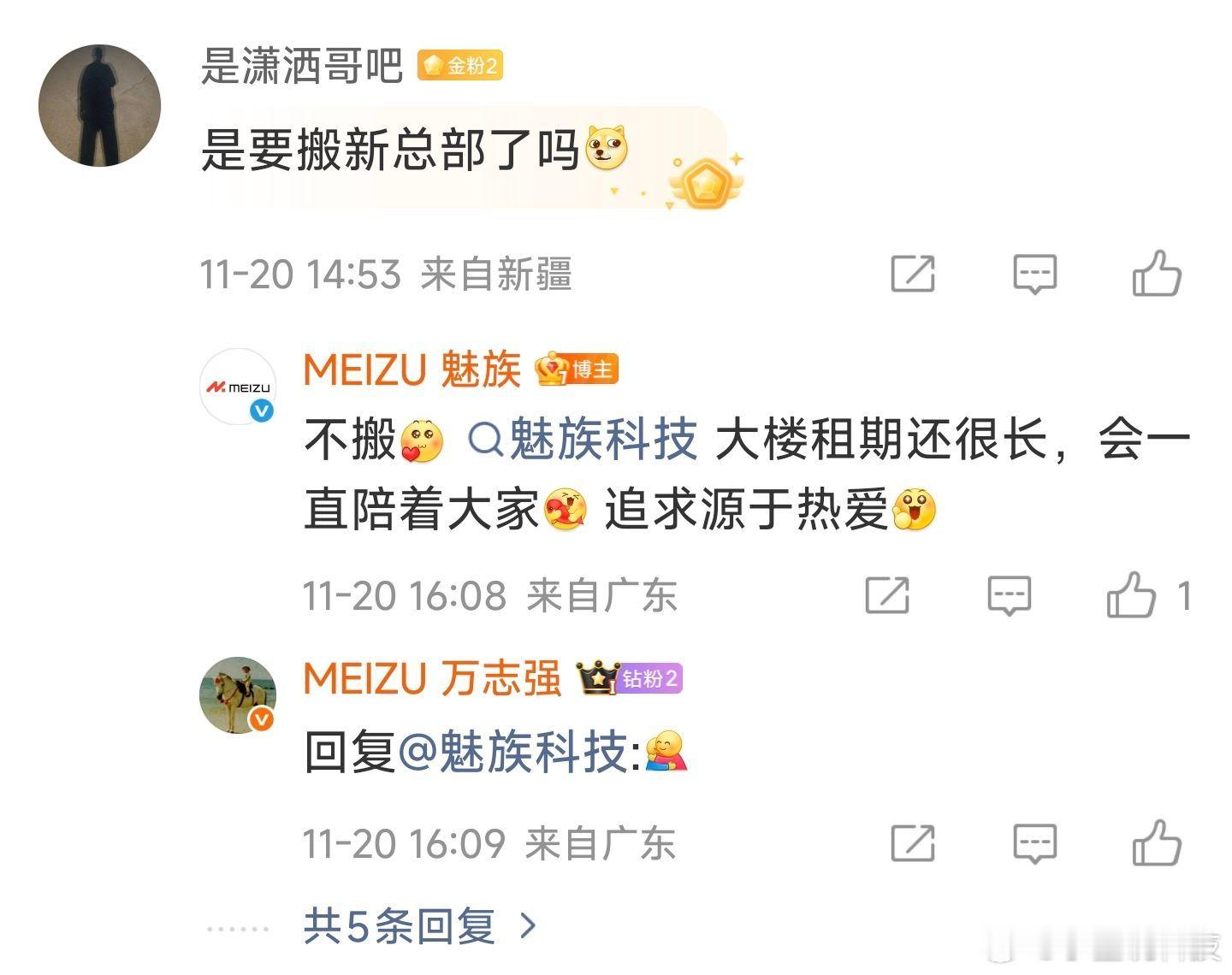 魅族官方表示魅族珠海总部大楼不会搬迁魅族科技官方微博在评论区与网友互动时表示:“不搬。魅族科技大楼租期还很长,会一直陪着大家。追求源于热爱。”魅族员工布鲁卡也发博确认总部大楼不会搬
