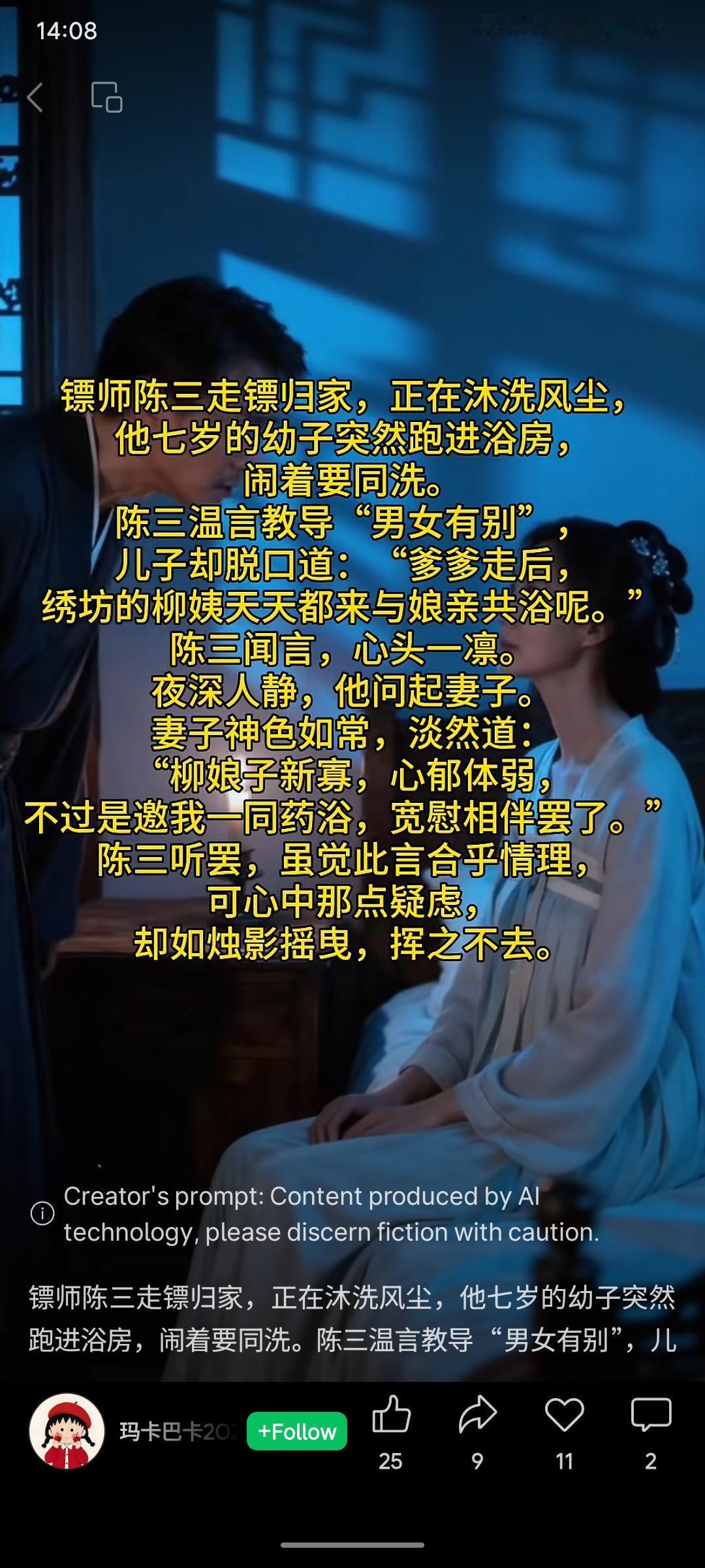 镖师陈三归家沐浴,幼子无意提及母亲常与绣坊柳姨共浴。妻子解释是为陪伴新寡的柳娘子药浴解郁。陈三虽觉合乎情理,心中疑云却悄然滋生。