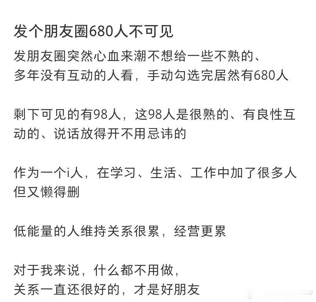 我几乎不太会去屏蔽别人,只是慢慢就不想发朋友圈了。不是怕谁看见,就是觉得没必要。为了发一条吐槽加班的动态,去研究怎么屏蔽老板。再者为了晒个素颜照,纠结要不要把亲戚分组,很累啊感觉。既然做不到小心翼翼筛选680个不可见,那干脆就不发了~
