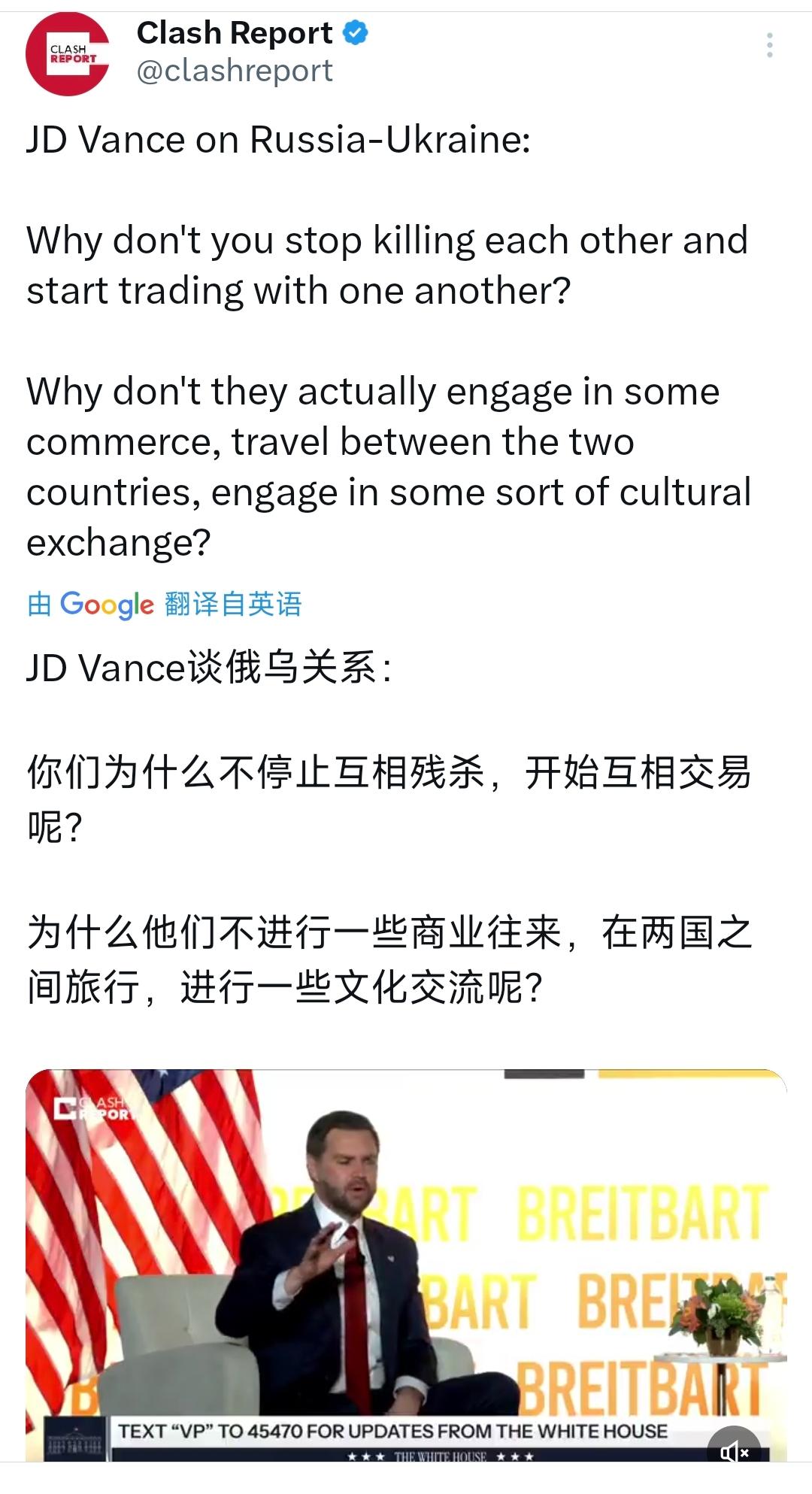 美国副总统JD 万斯今天(北京时间11月21日)谈论俄乌关系:“你们为什么不停止互相残杀,开始互相交易呢?为什么他们不进行一些商业往来,在两国之间旅行,进行一些文化交流呢?” 美国在俄乌冲突中扮演的从来都不是和平使者,而是彻头彻尾的拱火者。从怂恿乌克兰加入北约,不断挤压俄罗斯战略空间,到2012至2014年公然宣称“要帮助乌克兰打败俄罗斯人”,美国一直在背后推波助澜,将俄乌拖入冲突深渊。如今冲突升级、局势胶着,美国却轻描淡写地呼吁“和睦相处”,仿佛之前种种行径与己无关。这种“事前煽风点火,事后装无辜劝和”的做派,不过是为了掩盖其地缘政治野心,逃避自身责任,实在是虚伪又可笑。 要理解这种违和感,我们需要把时间拨回到更早之前。故事的脉络并非始于2022年的炮火,甚至也不仅仅是2014年的克里米亚。 一个关键的节点,是2008年的北约布加勒斯特峰会。在那次会议上,北约向乌克兰和格鲁吉亚发出了一个明确的信号:你们未来将成为我们的一员。 这个承诺在当时看来,或许像是给渴望融入西方的乌克兰画下的一张大饼,但在俄罗斯眼中,这无异于将一把尖刀抵在了自己的战略咽喉上。 一个历史上与自己渊源极深、边界线漫长的邻国,即将加入一个以自己为对手的军事联盟,这其中的地缘政治风险,恐怕任何国家都无法坐视不理。这并非为后来的行为辩护,而是试图理解,万斯口中“互相交易”的和平氛围,是从哪一个时刻开始被侵蚀的。 时间来到2014年,乌克兰的广场革命将局势推向了第一个高潮。在那场席卷基辅的抗议浪潮中,我们能看到一些非常耐人寻味的画面。 时任美国参议员约翰·麦凯恩亲自登上基辅独立广场的舞台,对人群高喊“你们正在实现一个伟大的事业”,并与后来被证明有极右翼背景的领导人并肩而立。 更具戏剧性的是,那段被泄露出来的电话录音,时任美国助理国务卿的维多利亚·纽兰在电话里与驻乌大使详细商讨着乌克兰未来政府的人选安排,甚至用一句粗口表达了对欧盟调解效率的不满。 这已经不是简单的“支持民主”了,而是近乎赤裸裸的幕后操盘。一个国家内部的政治更迭,其核心内阁成员的构成,竟然由另一个大国的官员在万里之外敲定,这很难让人相信美国在其中扮演的是一个被动的旁观者角色。 在随后的八年里,顿巴斯地区的火药味从未消散。明斯克协议一度为和平带来了曙光,但协议的执行过程却充满了曲折与反复。 俄罗斯指责乌克兰和美国根本没有诚意履行协议中关于给予顿巴斯地区特殊地位的条款,而只是在利用停火期整军备武。这八年时间里,来自美国的军事援助和军事顾问源源不断地进入乌克兰。 五角大楼下属的“全球和平行动倡议”等项目,为乌克兰军队提供了大量的训练,从战术指挥到单兵技能,几乎全方位地按照北约标准进行改造。 可以说,在2022年全面冲突爆发之前,乌克兰军队的“北约化”已经取得了长足的进展。这究竟是帮助一个主权国家保卫自己,还是在为一场更大规模的冲突做准备,答案似乎变得模糊起来。 如今,当战火已经让无数人流离失所,当经济被制裁的重锤砸得千疮百孔,万斯副总统却轻描淡写地提出了“互相交易”和“文化交流”的建议。 这番话听起来多么耳熟,因为在冲突爆发前,俄乌之间确实存在着紧密的商业联系和文化纽带。俄罗斯是乌克兰重要的能源供应国和市场,两国的民众可以自由往来,共享着相似的文化记忆和历史人物。 正是这些政治上的操弄和安全上的挤压,一步步斩断了这些联系,将两个兄弟民族推向了兵戎相见的境地。 现在,在亲手推动了这一切之后,却又回过头来怀念曾经的美好,这种“马后炮”式的和平倡议,究竟是出于真诚的悔悟,还是为了掩盖更深层次的战略意图? 当一个大国,一边向冲突的一方输送着足以改变战局的武器,一边又高喊着“为什么不和平”时,这本身就构成了一种极具讽刺意味的悖论。 这种将复杂的地缘政治博弈简化为邻里纠纷的口吻,或许能迷惑一些不了解前因后果的人,但历史的细节不会说谎。 从北约东扩的步步紧逼,到基辅街头的直接干预,再到长达八年的军事武装,每一步都清晰地指向一个方向。 那么,万斯的这番话,究竟是天真,还是一种更高明的政治表演?这或许是一个值得我们每个人深入思考的问题。