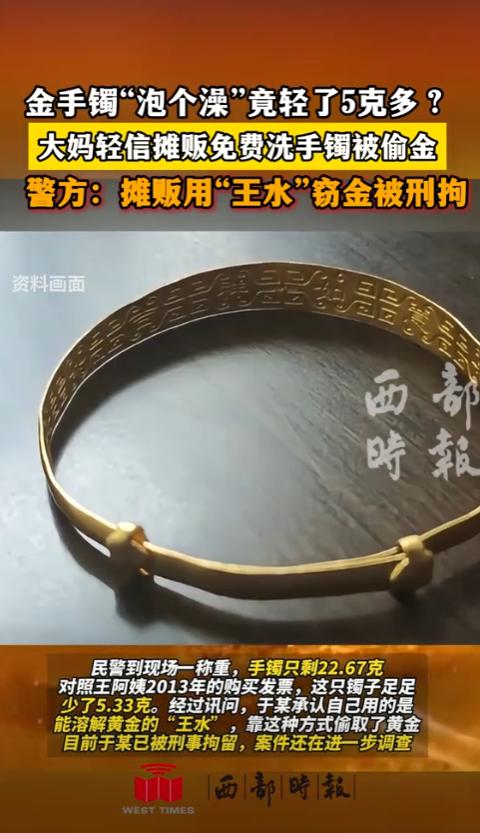 10月22日,浙江临海一大妈戴着金手镯去集市上时,突然被一位小伙拦住,对方声称可以帮大妈免费清洗一下金手镯,大妈一听不要钱就答应了,结果等她回家后却觉得金手镯变轻了,称重了一下发现被偷了5.33克!网友:免费的才是最贵的啊。 当天集市上人潮涌动,一位大妈慢悠悠地进入了熙熙攘攘的市场。她左手上戴着一只金光闪闪的手镯,看起来分量十足,造型经典。 就在她逛市场的时候,一名年轻的小伙突然拦住了她,脸上带着热情的笑容。他拿着一块布,夸赞道:“大妈,这手镯真不错啊!我们这儿今天搞活动,我可以免费帮您清洗,洗完绝对亮得像新的一样!” 一听是免费的,大妈的警惕心瞬间放下了。毕竟谁都喜欢爱占点小便宜,加上小伙子看起来挺专业的,她便心安理得地递出了手镯。 小伙一边用工具敲敲打打,一边向围观的群众解释:“这个手镯有点变形,清洗之前得先矫正一下。”随后,他从包里拿出一个玻璃杯,里面装着不明液体,状态粘稠,颜色却透亮。 他将手镯放入杯中,快速搅了几下,看起来干净多了,很快又将它擦干递给了大妈。“您看,是不是比之前亮了好多?” 大妈满意地戴上,连连称谢,随后慢悠悠地拎着菜篮回家,丝毫没有意识到危险已经悄悄发生。 起初,回到家的大妈并没有察觉异样。她继续干着家务,时不时瞄一眼腕上的手镯,亮得的确让人心情舒畅。直到不经意间摆动手腕时,一种轻微的异样触感让她停下了动作。 “怎么觉得有点轻?”这种念头在她心中一闪而过,但她很快否定了自己,觉得可能是长期佩戴后的错觉。然而,随着时间的推移,这种轻微的不适感愈发明显。她拿出自家买来称物品的小秤,将手镯放在了秤盘上。一看结果,她瞬间愣住了:22.67克? 想着手镯如今少了5.33克,大妈一下子慌了神。她反复称量,却多次得到相同的结果。短短清洗几分钟,5克黄金居然凭空消失了。 清洗手镯时,这名小伙用的杯中液体并不是普通清洁溶液,而是一种名叫“王水”的化学混合物。所谓“王水”,是由浓盐酸和浓硝酸按特定比例混合而成,具有极强的溶解性。它不仅能腐蚀普通金属,甚至连黄金这种惯性金属也无法幸免。 在短短几十秒的清洗过程中,手镯表面的黄金被悄无声息地溶解进液体中。而结合这些被溶解的金元素,小伙子之后可通过化学方法重新提炼出纯金换钱。 这个过程隐蔽而高效,受害人根本无法察觉。更可怕的是,表面被清洗过的首饰看起来反而“焕然一新”,对于完全不了解其中原理的普通人来说,这一切就像是魔术。 尤其是在集市、乡镇的摊位上,屡屡上演这样的骗局。老年人往往对“免费”、“优惠”等字眼毫无防备,再加上骗子每次抓准的,就是利用他们对化学知识的缺乏以及爱占小便宜的普遍心理。 他们的目标一开始不仅仅在于骗某一个大妈,而是希望习惯在集市上活动的中年、老年人群体彼此传播这种“方便实惠”的服务。他们乐于围观新奇事物,也更容易被短暂的“甜头”打动而忽视潜在风险。 还是要提醒一下,日常佩戴的金银首饰若出现问题或需要保养,理应前往专业金店或高资质的首饰加工点进行处理。正规机构不仅流程透明,设备标准化,有问题也能有效维权,远比将贵重物品交给陌生小贩靠谱得多。 这件事可以看出,针对老年人群体的骗局屡次得手,和骗子的隐秘手段、受害人防范意识的薄弱密切相关。无论是类似这次的化学“清洗陷阱”,还是更早之前“摔破假玉器要求赔偿”的街头骗局,都是通过放大老年人对善意和信任的美好想象,让他们一步步掉进事先设计好的圈套。 而这种善意和信任的缺失,不仅伤害了具体的受害人,也伤害了整个社会的信任基石,长此以往,凡事都不敢相信的风气或将成为常态。 希望通过一次次宣传提醒和警觉传播,让更多人提高警惕。捂紧自己的钱包,守好手上的贵重物品,也守好那些关乎我们愉快生活的简单信任。 信息来源:西部时报2025-10-24---大妈免费洗手镯被偷金5克多 王阿姨听说可免费洗金便爽快答应,不曾想洗完后手镯变轻变软,当即报警求助。警方:摊贩用“王水”盗窃5.33克黄金,已被刑拘。