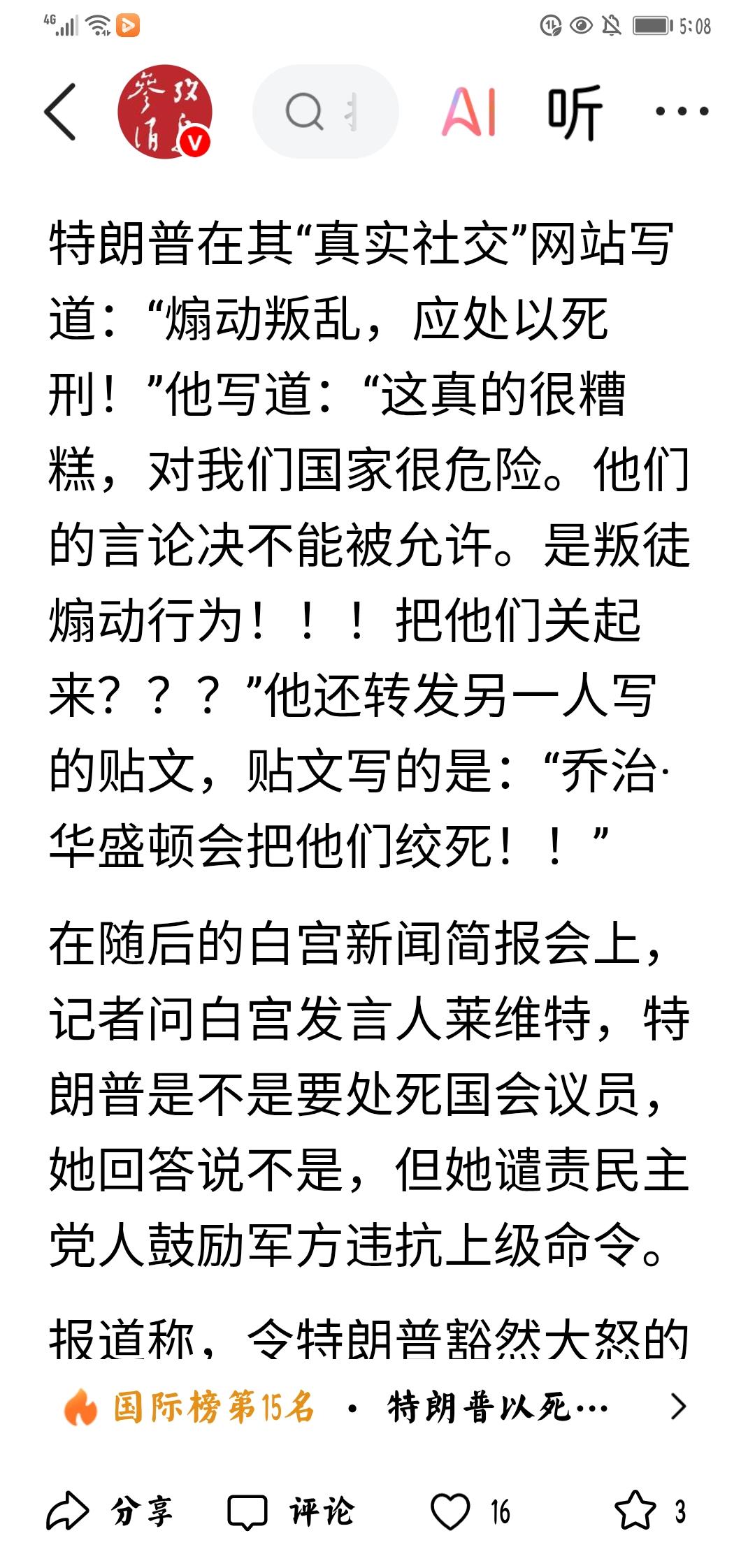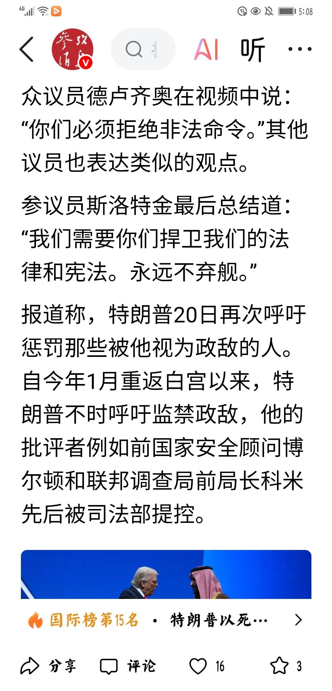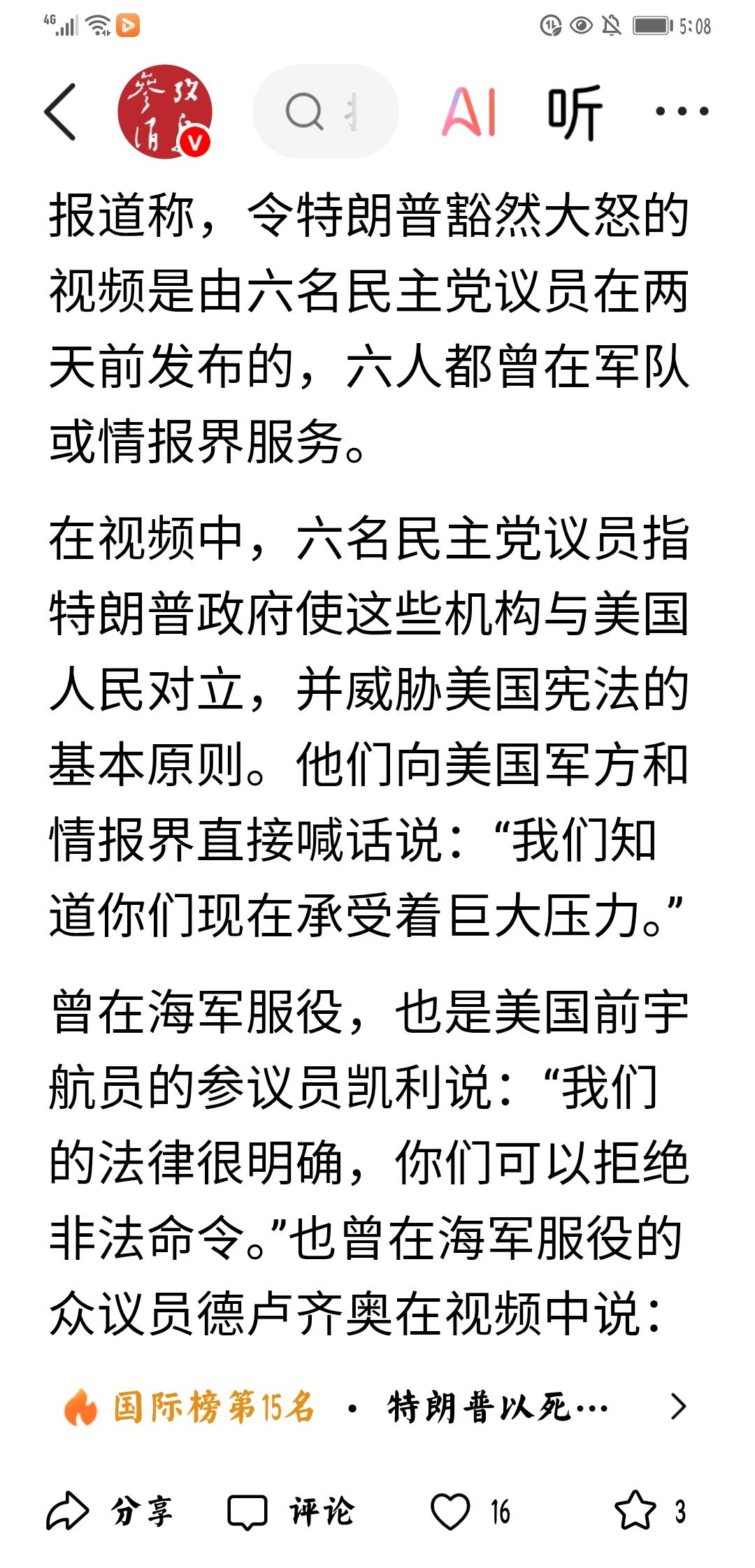 让人难以置信 个人观点•大概率预判: 现在的美国两党内斗,已经毫无下限。美国民主党居然鼓励军方人士,拒绝军令。 全球人都知道的一个道理:“军人以服从命令为天职”这可以说是全球军人刻在骨子里的DNA。 在当下的美国,居然有政客鼓励军方人士,拒绝命令。难以置信,大出意料之外。 看来这是征兆,美国的政界和军界即将爆发冲突。看来美国战争部长即原来的那个电视主持人,可有的忙了,不知是否镇得住场子?