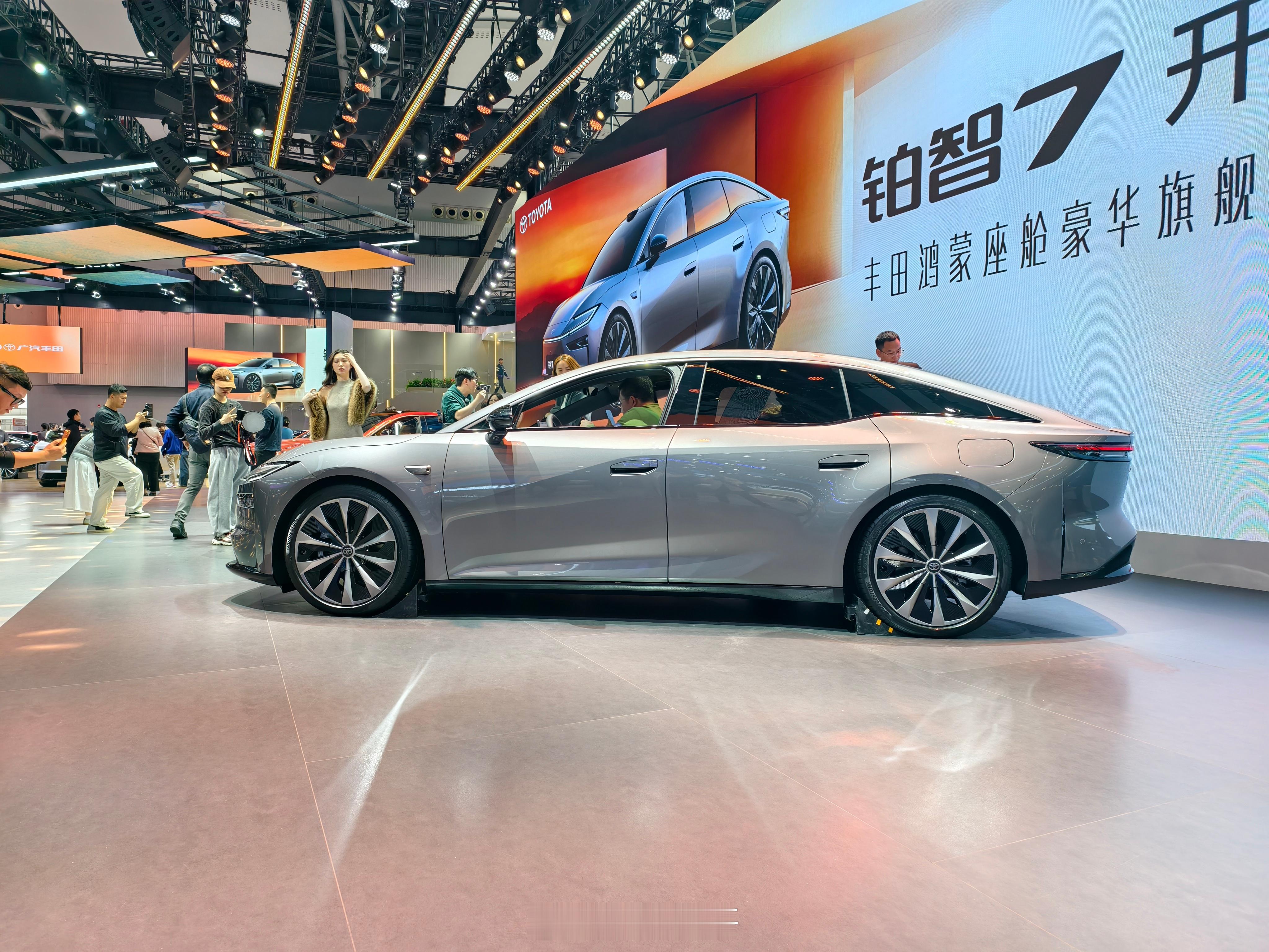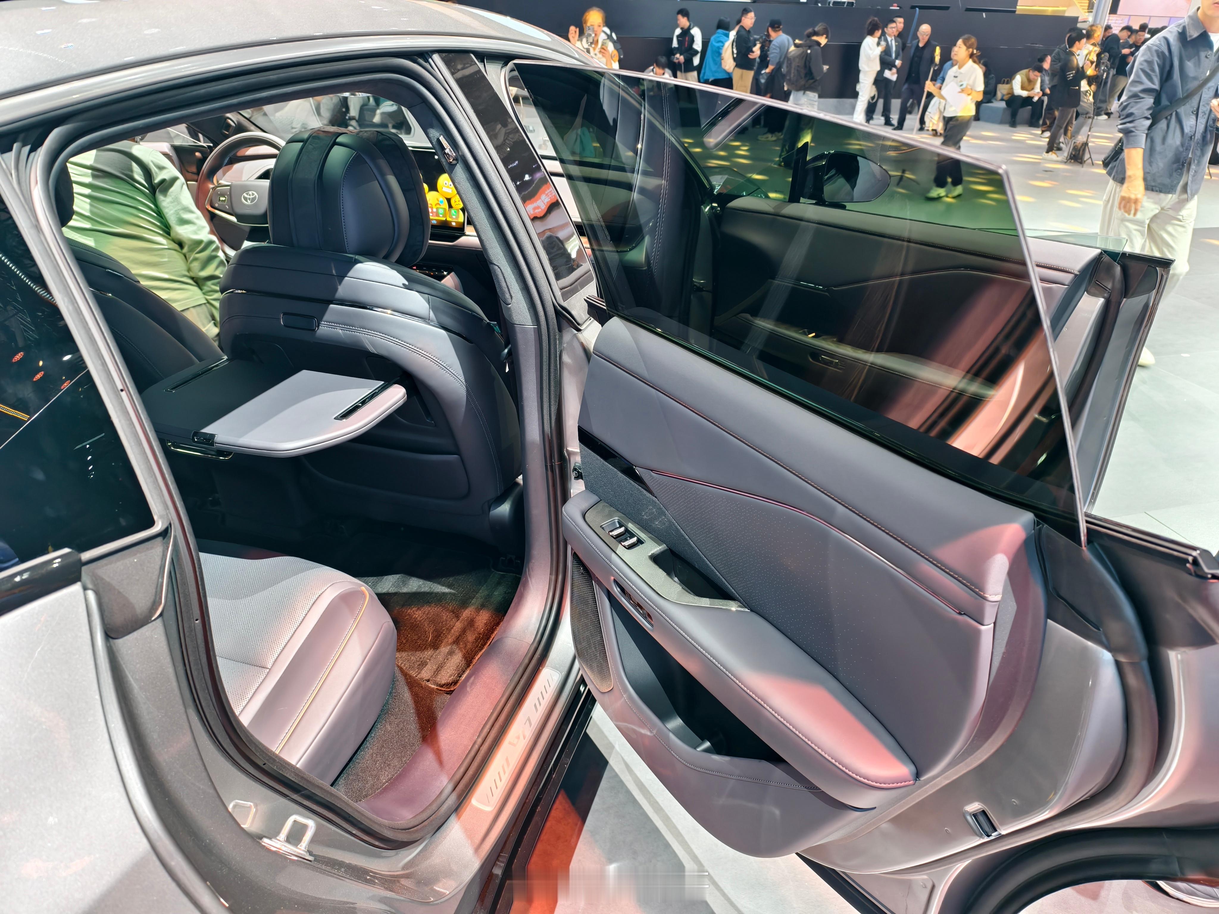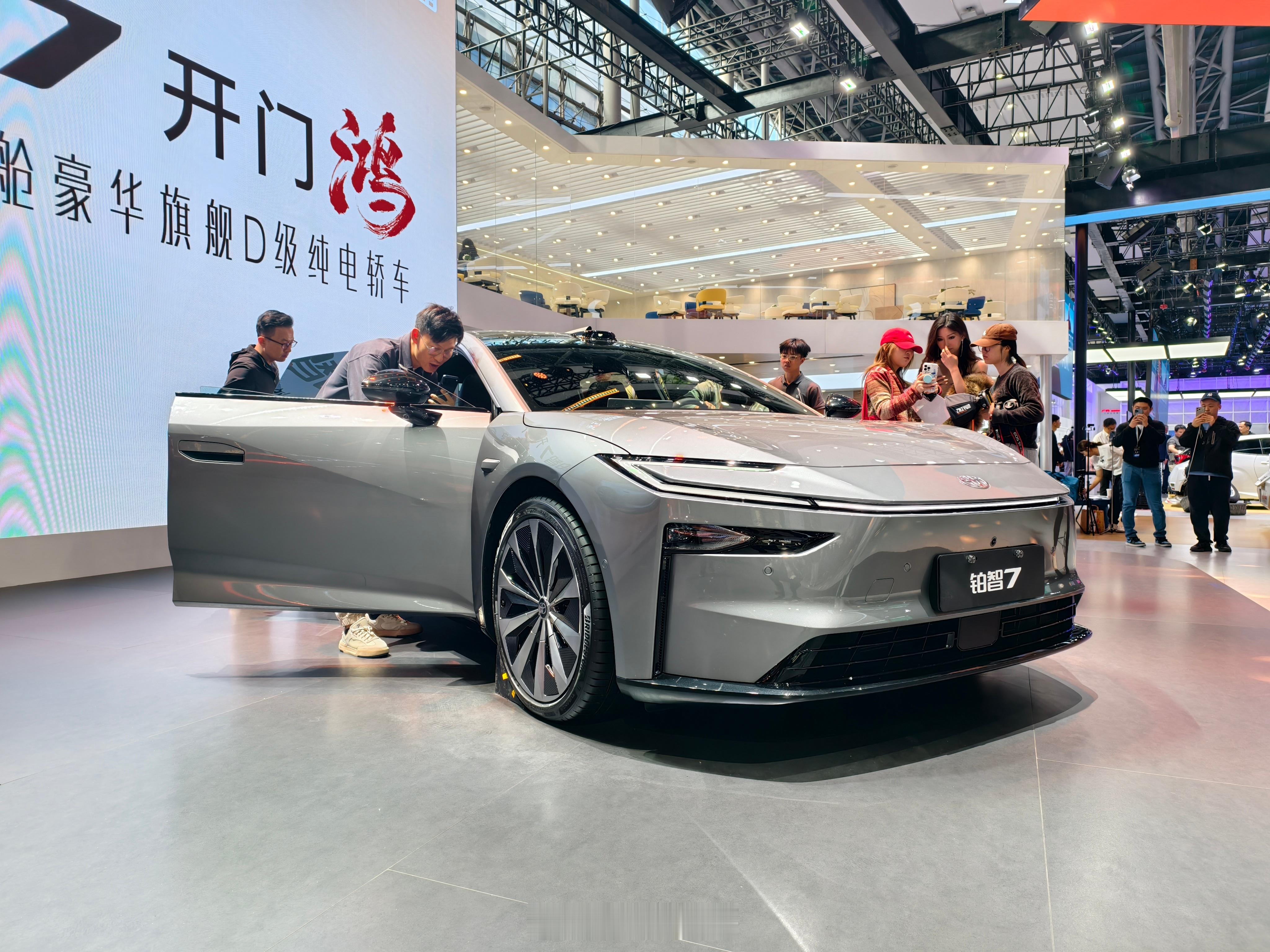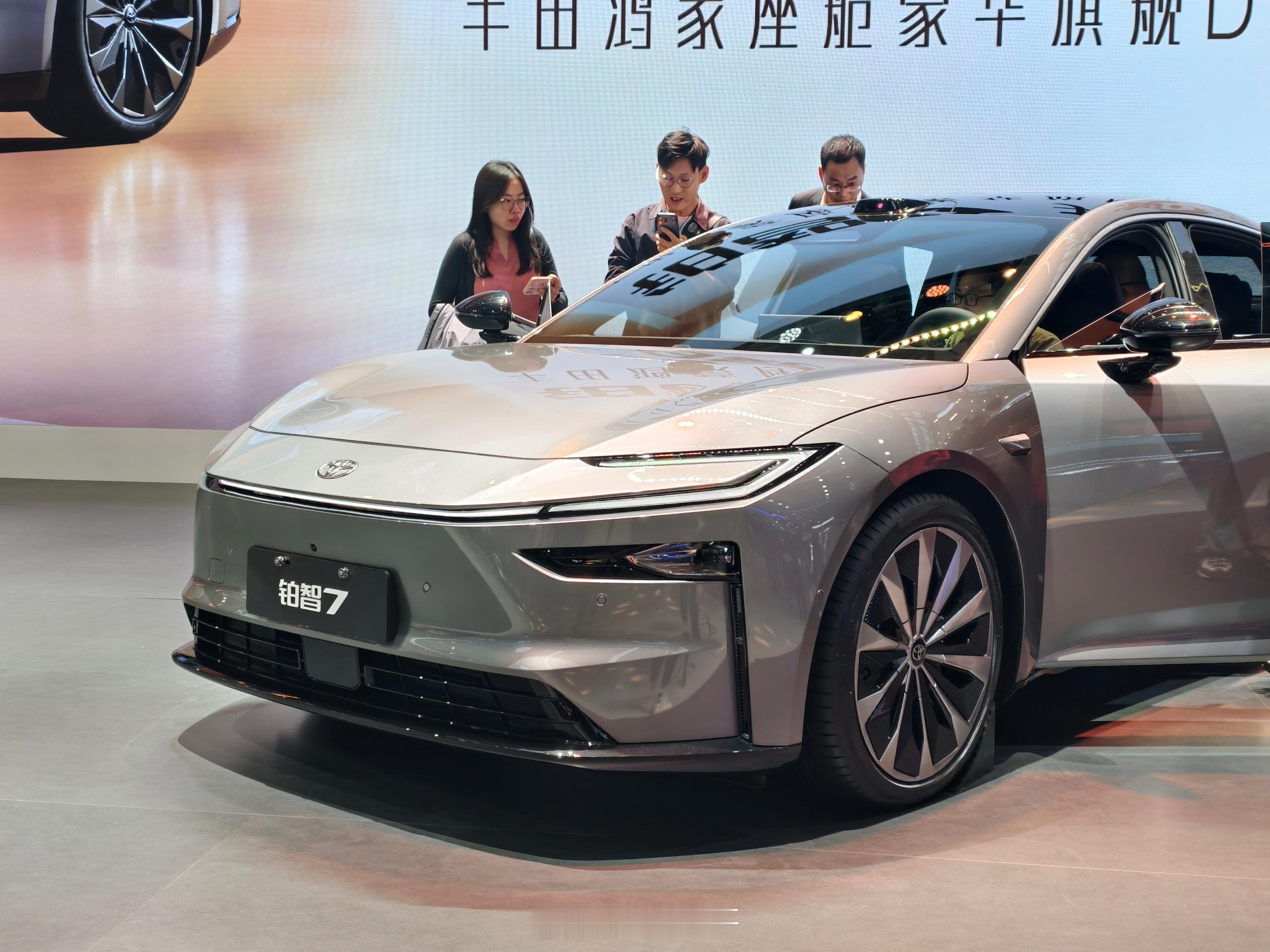 铂智7,同事说侧面角度很像皇冠Sedan,能看出比较明显的差别应该是车头的长度了。挺期待的一款车,应该说是丰田真正意义上的纯电大车,而且含华量很高,华为的鸿蒙座舱和DriveONE电机,也是反向“合资”了。其他比较精细的地方:无边框车门配上这个车身姿态现场看真的很优雅;后排空间很舒服,而且老板位破天荒有了个小桌板。期待动态试驾表现~