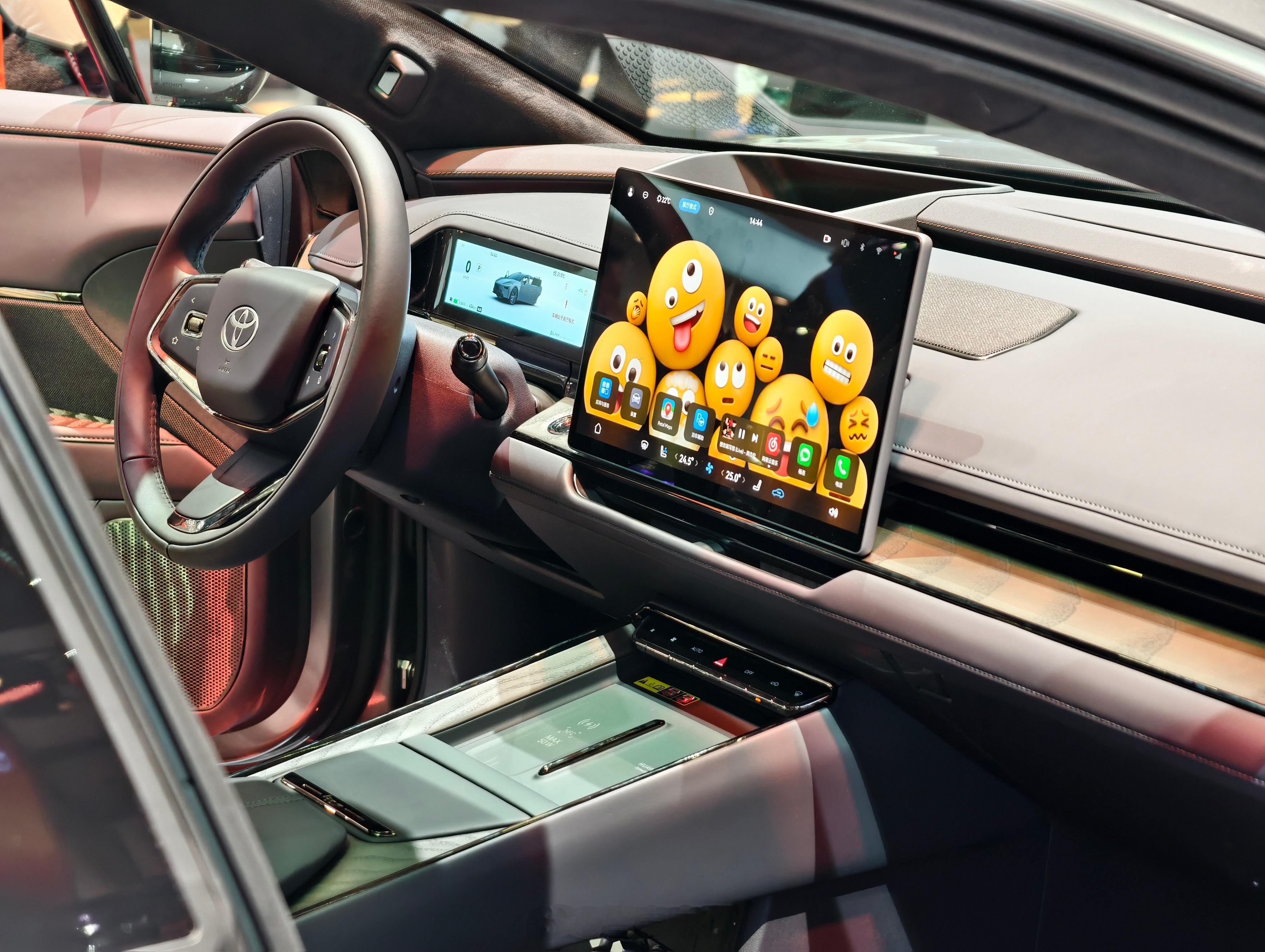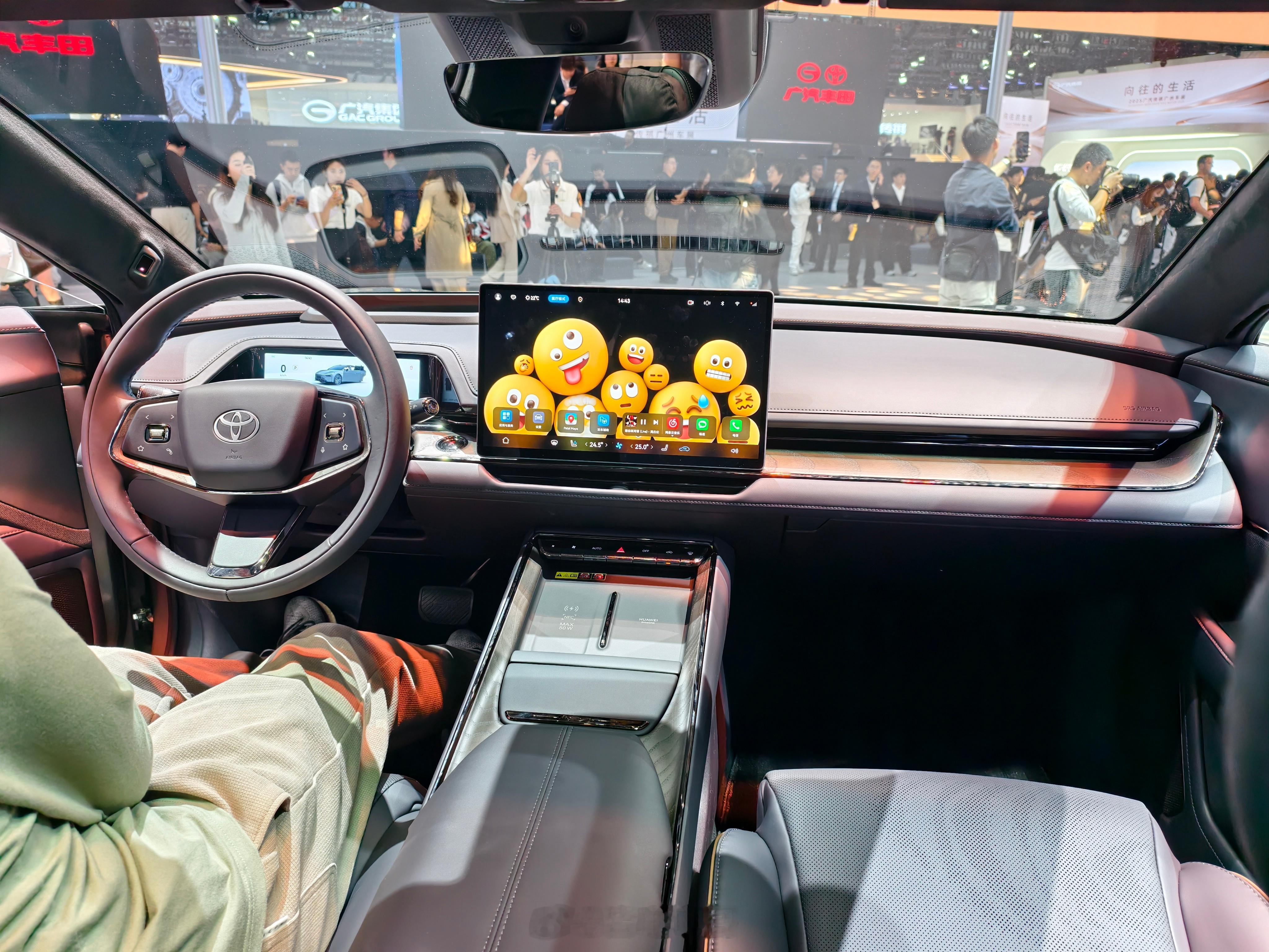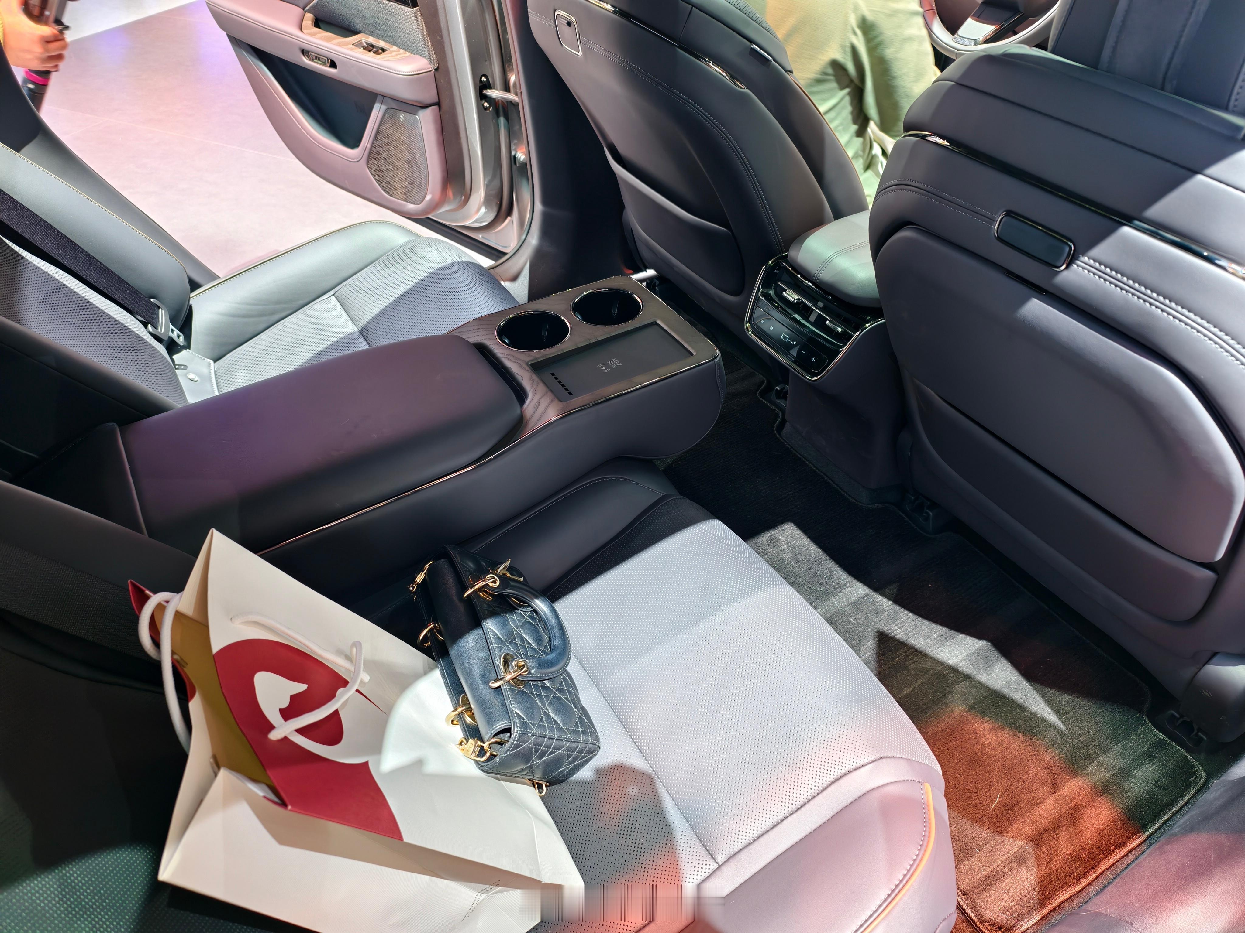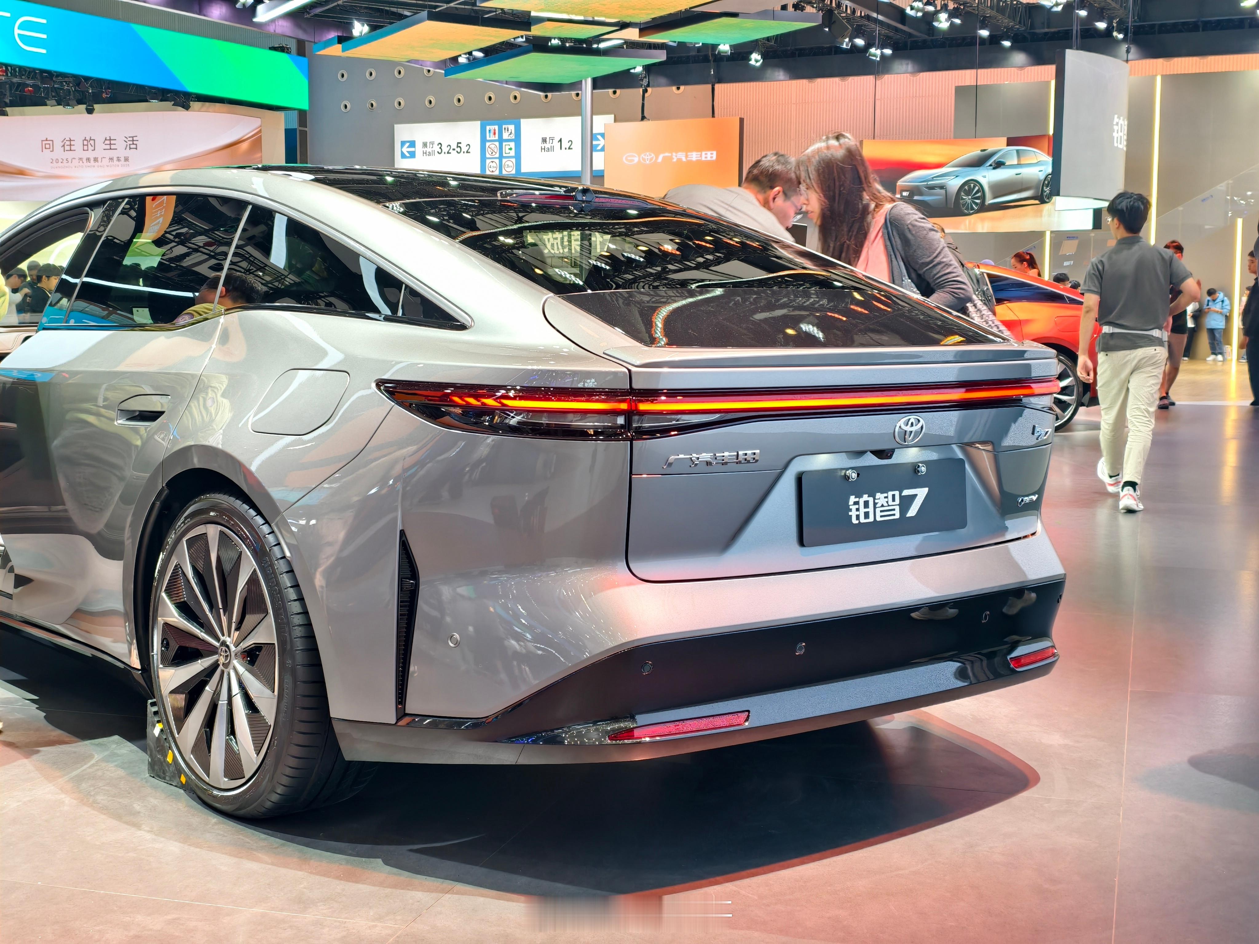 铂智7,同事说侧面角度很像皇冠Sedan,能看出比较明显的差别应该是车头的长度了。挺期待的一款车,应该说是丰田真正意义上的纯电大车,而且含华量很高,华为的鸿蒙座舱和DriveONE电机,也是反向“合资”了。其他比较精细的地方:无边框车门配上这个车身姿态现场看真的很优雅;后排空间很舒服,而且老板位破天荒有了个小桌板。期待动态试驾表现~