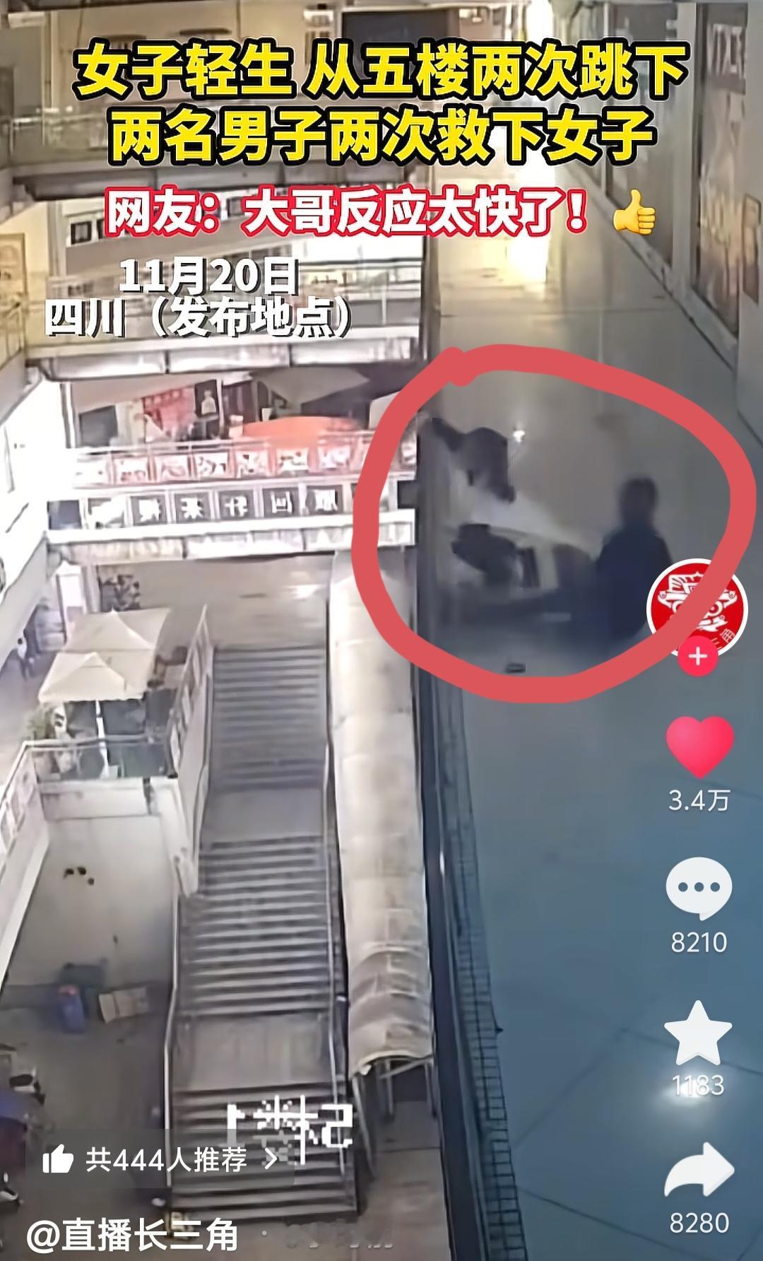 我宣布, 这个女孩是最幸运的人, 一分钟内两次跳楼都被救下,两个男子硬将她从死亡线上拉回, 视频我看了好多次,这个女子的行为太果断了,刚救下,就再次冲向栏杆,看到她的行为,不敢想她受到了多大的伤害, 两个救人的男子值得表扬,反应速度太敏捷了,我看视频都没反应过来,他俩就已经出手了。 这个女子接下来就好好生活吧,低谷之后就只会向上走了。 对此,你们怎么看?