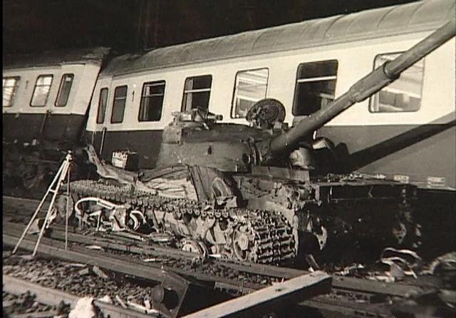 坦克撞火车苏军驻东德集团军干过,用世界第一款三代坦克T64撞上了载人的列车,列车拥有一个80吨重的火车头和13节车厢以110公里的时速被坦克撞毁了6节,80吨重的火车头直接被T64坦克撞翻。 说起冷战后期那会儿,东德土地上发生的事儿,总让人觉得时代变迁里藏着不少荒唐。1988年1月19日下午,苏军第八坦克师在福斯特·齐纳基地附近搞夜间驾驶训练,一辆T-64A坦克直接卡在了柏林-哈雷铁路线上头,正好挡住一趟从莱比锡开往施特拉尔松德的快速列车D 716。这趟车拉着12节客车厢加一节餐车,总共13节,车头是东德铁路的DR 211型柴油机车,重达80吨,里面塞了差不多450名乘客,大多是工人和学生赶着回家过年。列车以110公里的时速冲过来,刹车来不及,直接从侧面怼上坦克。结果呢,80吨重的车头被撞得翻了个个儿,六节车厢脱轨堆成一堆,两名火车司机当场没了命,另外四名乘客在送医院的路上也没抢救过来,总共六条人命没了,33个人带伤。这事儿在东德铁路史上排得上号的惨案,苏军坦克部队的训练失误直接酿成大祸。 先说说这辆T-64A吧,它可是苏联六十年代末搞出来的第一款第三代主战坦克,重量38吨出头,装了复合装甲和自动装弹机,火力机动性在当时算顶尖。可这玩意儿设计太复杂了,传动系统和电子元件一到冷天就爱出毛病,部队里经常报小故障。事故那天,这辆坦克是训练专用款,没上弹药也没装炮手,就用来教新兵开车。驾驶位上坐的是个19岁的哈萨克小伙子,叫奥哈波夫,俄语说得磕磕巴巴,刚入伍没几个月,还在适应部队节奏。旁边指导的是20岁的俄罗斯下士安德烈·彼得胡夫,服役一年多,经验不算少,但那天他也没能兜底。两人从基地开出来,本来是例行机动,绕着林区转悠。坦克接近铁路平交道口时,彼得胡夫让右转避开轨道,可奥哈波夫可能因为语言不通,误会了指令,直接往前冲。眼看不对劲,彼得胡夫赶紧用无线电喊停,没反应,又拉紧急开关想切断引擎,谁知开关坏了,坦克直接熄火卡死在铁轨上。俩人一看来不及了,干脆跳车跑了,留坦克在那儿当路障。 这铁路线是东德交通大动脉,平时苏军坦克训练就爱在这附近横冲直撞,铁轨边上没啥防护,东德铁路局早有怨言,说苏军坦克老是压弯轨道,影响行车安全。列车司机那边也知道这段路邪门儿,训练时间段他们总想绕道,可那天D 716准点发车,机车长拉满油门,乘客们在车厢里聊天看报,谁也没想到会撞上这么个铁疙瘩。碰撞那一瞬,80吨车头正面怼坦克侧履带,动能全砸上去,坦克被拖着滑了130米,履带断了但主体装甲纹丝不动,炮塔稳稳的。列车那边就惨了,车头翻出轨道,锅炉爆裂蒸汽乱喷,后面六节车厢轮子离轨,车体叠罗汉,玻璃行李撒一地。救援队赶到时,天都黑了,东德警察封了现场,苏军士兵帮忙抬人,临时帐篷里医生忙着止血包扎。整个清理花了三天,起重机才把车头吊起来,铁轨焊好才能通车。 这事故一出,东德和苏联的关系本来就绷着,这下更添火药味儿。八十年代末,戈尔巴乔夫推改革,东德领导人昂纳克不买账,两边外交上小摩擦不断。东德警方破天荒地把奥哈波夫和彼得胡夫抓起来审,东德人还申请拍坦克内部照片,查故障零件,得苏军上级点头才行。报告写得直白:坦克熄火是机械问题,列车司机刹不住,责任全在苏军头。俩人审完48小时内就被打包送回莫斯科,交给苏军军事法庭。法庭上翻训练日志,查操作记录,彼得胡夫因为指导不力挨处分,奥哈波夫经验浅也跑不了。俩人下场不明朗,有说法是重罚甚至枪毙,但苏联官方只说“他们得到了应有的惩罚”,具体没细表。东德铁路局狮子大开口,要苏军赔1350万马克修车修路,苏方拖着没给,账单黄了。 搁在当时,这事儿在东德媒体上报道得挺敞亮,不像以往苏军出事总捂着。西德电视台第二天就播了,民众议论纷纷,东德人开始公开吐槽苏军训练乱套。福斯特·齐纳基地是苏军大本营,占地几千公顷,坦克天天在这儿练,周边铁轨成坦克道,事故前就出过小毛病,像坦克压弯轨导致晚点啥的。这次大祸后,基地周边铁轨边上加了龙牙混凝土桩,挡坦克过道,夜训程序也改了,强调设备检查和语言协调。新兵训练多加俄语课,避免误会。T-64的毛病也暴露无遗,这坦克虽先进,但维护门槛高,苏军在东德驻扎几十万兵,装备更新跟不上,类似故障不是头一回了。 放长远看,这撞车事件像个小缩影,映出冷战末尾华约阵营的松动。苏军在东德有50多个师,坦克上万辆,训练强度大,但后勤和协调跟民用交通总有摩擦。东德人表面上兄弟国家,心里早有疙瘩,这事儿一闹,舆论压力上来了。苏联解体前,东德也跟着变天,1990年两德统一,苏军撤军时基地扔下一堆烂摊子,包括这事故留下的疤。坦克那头呢,T-64服役到九十年代,乌克兰和俄罗斯还用着,但早期型号的可靠性问题一直被诟病。