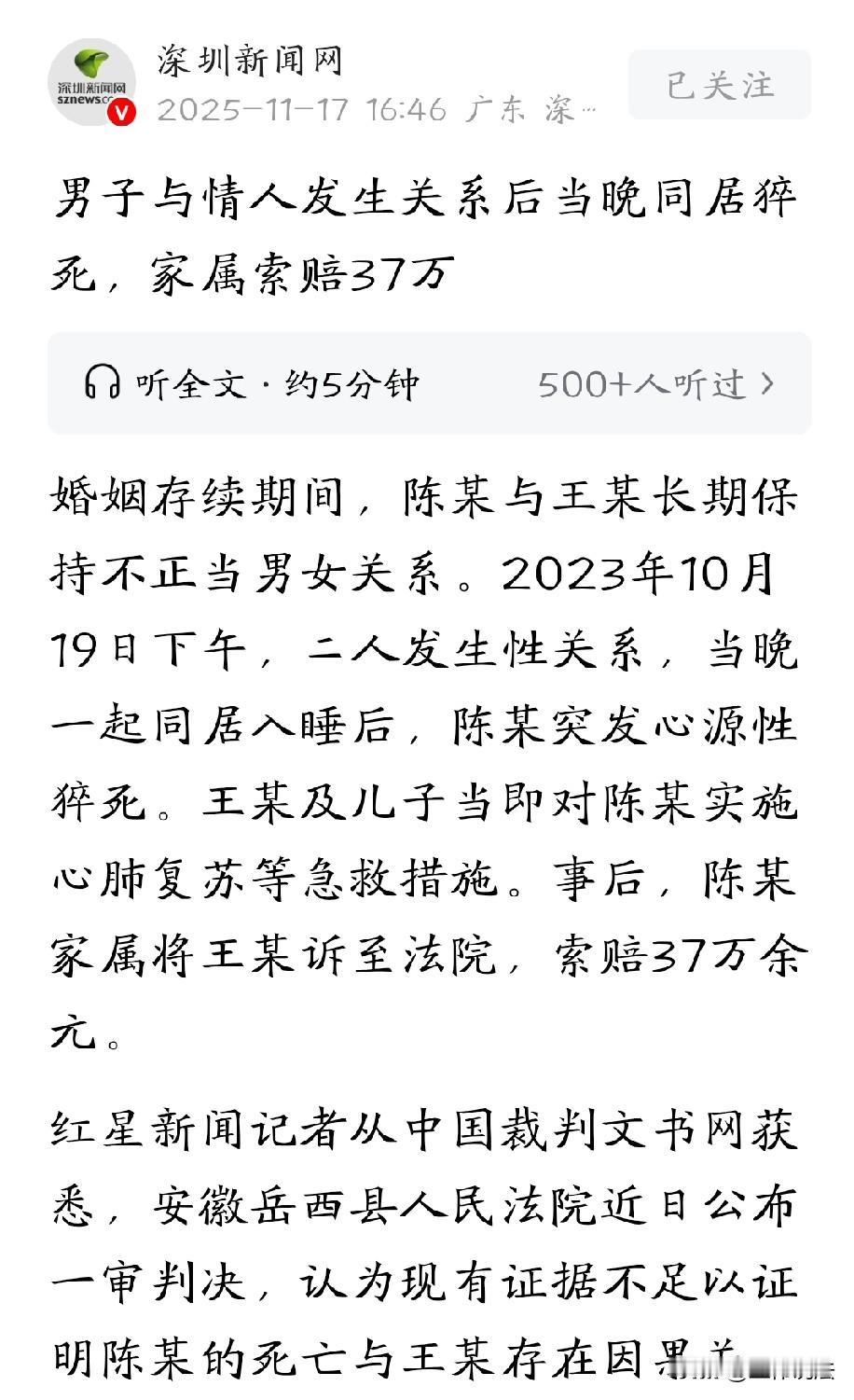 安徽安庆,男子婚内出轨,不仅和情人长期在出租屋内同居,甚至感冒发烧期间还要和情人发生关系。完事后,男子双腿发软,止不住颤抖,还以为是感冒后遗症,就没当回事。不料,男子当晚就猝死在床,情人紧急救助,还是回天乏力。男子的家属一气之下把情人告上法庭,索要37万的赔偿。法院审理后,认定情人没有过错,但还是判决赔偿3万元。 2023年10月,陈某和情人王女士发生关系后,竟突然猝死在出租屋,这段见不得光的关系再也瞒不住。 40多岁的男子陈某有家有室,却和王女士暗生情愫,两人瞒着陈某的家人,偷偷发展成了不正当男女关系。 为了方便两人相处,2023年8月起,陈某直接搬到王某租住的房子里,两人公开以情侣名义同居,完全不顾及道德的批判和家人的感受。 同居期间,陈某身体不算太好,加之曾经还做过胰腺手术,他一直是病怏怏的状态,但这一切王女士并不在意。 2023年10月上旬,陈某突发感冒、咳嗽加发烧,王女士还陪着他,一起去附近诊所看病,前后输液治疗了五次才稍有好转。 可没安稳几天,10月18日,陈某的感冒又反复了,再次发烧咳嗽,两人又去诊所输了两次液,医生特意叮嘱要多休息,避免劳累。 但陈某没把医嘱放在心上,10月19日下午,身体还没完全康复的他,向王女士提出要发生性关系。 王女士当时虽有些犹豫,觉得他还在生病,可架不住陈某一再要求,最终还是答应了。 完事之后,陈某突然双腿发软,浑身止不住地颤抖,王女士见状有些担心,连忙问他要不要去医院看看。 可陈某却摆摆手,并没当回事,还以为是感冒没好透的后遗症,休息休息就没事了。王女士见他坚持,也就没再多劝。 当天晚上,王女士洗完澡出来,看到陈某状态还算平稳,也就放下心来,两人各自睡下。 到了10月20日凌晨0点左右,王女士突然被一阵怪异的鼾声吵醒,她转头一看,发现陈某侧躺在床上,头耷拉在枕头上,嘴角流着口水,还开始翻白眼,这情况明显不对劲。 王女士瞬间慌了神,心里又怕又急,赶紧上前叫陈某,可不管怎么喊,陈某都没有任何回应。 她吓得浑身发抖,连忙叫醒了自己的儿子,让儿子帮忙一起想办法,同时颤抖着拿起手机,拨通了120急救电话。 挂了电话后,母子俩按照平时了解的急救知识,给陈某做人工呼吸和心肺复苏,盼着能有奇迹发生。 可遗憾的是,医护人员赶到后,立刻对陈某进行了生命体征检测,心电图显示,陈某已经没有了生命迹象。 之后医护人员又将他送往医院进行进一步急救,经过几次心电图检测确认,医生当场宣布陈某死亡。 这期间,王女士还及时拨打了110报警,向警方说明了情况。 事后,医院出具的居民死亡医学证明书上,明确写着陈某的死亡原因为心源性猝死,家属姓名一栏填的还是王女士。 陈某的家人得知消息后,悲痛又愤怒,他们认为陈某的死和王某脱不了干系,要是王某当初能及时劝阻陈某,或者在他出现不适时第一时间送医,可能就不会发生这样的悲剧。 陈某的家属一气之下将王某告上了法庭,要求她赔偿各项损失共计37万余元。 那么,法院究竟会如何审理呢? 《民法典》第1165条规定:‌行为人因过错侵害他人民事权益造成损害的,应当承担侵权责任。 法院审理认为,陈某作为完全民事行为能力人,明知自己做过胰腺手术,身体状况不佳,还在感冒发烧期间过度劳累,对自身健康没有尽到谨慎注意义务。 王女士虽然和陈某是非法同居,但发现陈某不对劲后,王女士第一时间拨打了120和110,尽到了相应的义务。 而且,从现有证据来看,不足以证明陈某的猝死与王女士之间存在直接因果关系,王女士对陈某想猝死不存在过错。 另外,法院指出,王女士明知陈某有配偶,还与其长期保持不正当男女关系并非法同居,这种行为严重违背了公序良俗和家庭美德。 《民法典》第1183条规定:侵害自然人人身权益造成严重精神损害的,被侵权人有权请求精神损害赔偿。 陈某是在与王女士同居期间死亡,这给陈某的家属带来了巨大的精神打击,对其家庭也造成了一定的伤害,应当承担相应的精神损害赔偿。 最终,法院酌情判定王女士补偿陈某家属精神损害抚慰金3万元,驳回陈某家属的其他诉讼请求。 经过法院这么一判决,这段见不得光的同居关系,也就彻底曝光出来,王女士丢了清誉不说,还要赔偿3万元。