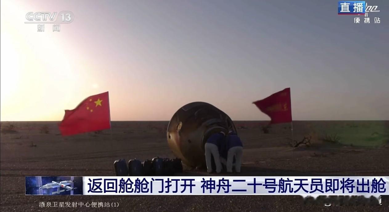 中国航天太牛了!神舟二十号飞船乘组人员返回舱安全着陆了! 在太空服役二百多天的三个宇航员安全回家了!!! 看着降落伞缓缓打开,飞船返回舱速度得到了很好控制。开始了每秒10米的速度下坠! 到了离地面十米距离,反推发动机准备点火,离地2米立即反推! 返回舱安全着陆,舱内宇航员检测全部安全! 地面检测和应急小组人员有条不紊的进行仓内接人工作! 我们的祖国真的越来越强大! 太空来去自如啊! 给中国的航天人点赞! [大笑][给力][赞][赞][赞]