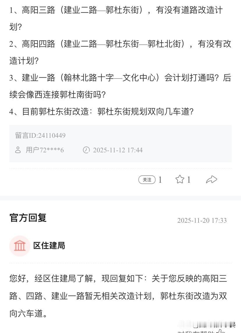 郭杜片区的路网规划 你好,想咨询下: 1、高阳三路(建业二路—郭杜东街),有没有道路改造计划? 2、高阳四路(建业二路—郭杜东街—郭杜北街),有没有改造计划? 3、建业一路(翰林北路十字—文化中心)会计划打通吗?后续会像西连接郭杜南街吗? 4、目前郭杜东街改造:郭杜东街规划双向几车道? 官方回复 2025-11-20 17:33 区住建局 您好,经区住建局了解,现回复如下:关于您反映的高阳三路、四路、建业一路暂无相关改造计划,郭杜东街改造为双向六车道。