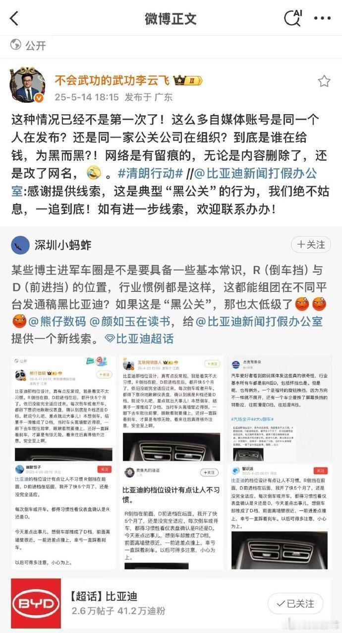 档位设计都被黑?比亚迪最高悬赏500万,持续打击“黑公关”现象 作为新势力品牌的标杆,比亚迪的崛起,让国产车有了正面和合资车抗衡的实力,如今的比亚迪不仅仅在国内市场上销量迎来了大爆发,在海外市场上也是展现出了很强的统治实力,比如现在的比亚迪已经成为欧洲多个国家的新能源销冠品牌。 比亚迪巨大的成功,确实让国人感受到了国产新能源车崛起带来的自豪,但是“人红是非多”,比亚迪销量的爆发,让个别车企产生了眼红、妒忌的心理,这两年市场上频频出现抹黑比亚迪的帖子。 近日市场上又出现了很低级的抹黑现象,个别博主竟然齐齐发文指责比亚迪R(倒车挡)与D(前进挡)的位置,我们都知道,行业惯例都是这样,这都能组团在不同平台发通稿黑比亚迪?如果这是“黑公关”,那也太低级了! 比亚迪一直很尊重并接受社会各界的建议和监督,但网络不是法外之地,对于散布失实信息、蓄意抹黑比亚迪品牌声誉的行为,我们将坚决采取法律手段,早在2021年,比亚迪就宣布悬赏5万至100万元打击黑公关,为了进一步加强行动效果,比亚迪直接将举报奖励提升至5万至500万元,并长期有效! 新能源汽车发展到今天非常不容易,国产品牌一起进步才能够缔造更好的汽车环境,相信随着比亚迪在海外攻城拔寨的发展,我们很快就会在世界每个角落看到比亚迪新能源汽车的影子。