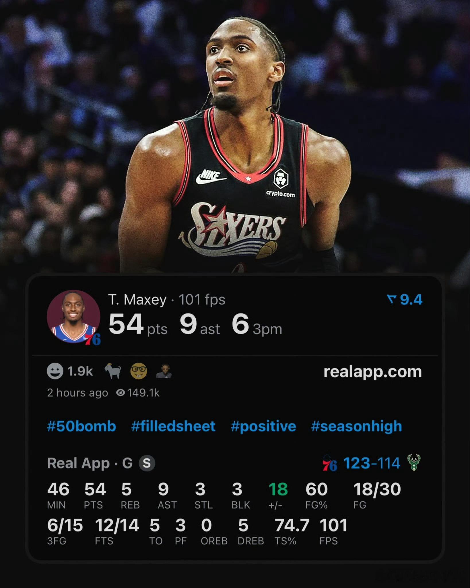 费城新王诞生!马克西新赛季的表现力压SGA!他可是21顺位的球员!新赛季第六位50+诞生!马克西在今天对阵雄鹿的比赛中,打出了其职业生涯至今最闪耀的一战,不仅刷新了个人得分纪录,还缔造了NBA独一无二的历史,并带领球队通过加时赛取胜。在这场76人客场123-114击败雄鹿的加时鏖战中,马克西的表现堪称完美!他全场砍下54分,刷新了自己此前52分的个人单场得分纪录(2024年4月7日对阵马刺)。全能数据历史第一!除了54分,他还贡献了5篮板9助攻3抢断和3盖帽。这使他成为NBA历史上首位能单场打出至少 54分+5篮板+9助攻+3抢断+3盖帽 这一全能数据的球员,前无古人。比赛最后时刻,正是马克西突破造犯规并两罚全中,帮助球队在常规时间最后7秒扳平比分,将比赛拖入加时。而在加时赛中,他再得6分,为球队锁定胜局立下头功。新赛季的马克西完成了从全明星到超级巨星的蜕变,其表现堪称现象级:在进攻端爆炸输出,算上本场的54分,这已是他本赛季第3次单场得分40+,成为本赛季第四位达成此成就的球员,与东契奇、库里和马尔卡宁并列。另外他还是本赛季最快达成500分与100助攻的后卫,并且是赛季至今唯二总得分突破500分大关的球员,另一位是雷霆的亚历山大。在球队核心恩比德因伤缺阵的多场比赛中,马克西扛起了球队,场均能够贡献33.4分4.7篮板和7.9助攻的全面数据,带领76人取得了9胜6负的战绩排名东部第六,在赛季初期他也带领球队拿过4连胜开局!这次拿到50+后,他也成为新赛季至今第六位拿到50+的球员,前五位分别是亚历山大55分,戈登50分,里弗斯51分,马尔卡宁51分,约基奇55分!马克西已经成为新赛季MVP竞争中的一匹黑马!凭借开赛以来的持续高光表现,马克西已经进入了本赛季常规赛MVP的讨论范围。在美媒Basketball Reference更新的MVP概率榜上,马克西以0.2%的概率位列第八,最高排第七,目前MVP最新榜单还未公布,但是凭借近期的表现,他应该会再上升几个位置!这也标志着这位年轻后卫正式迈入了联盟顶级球星的行列!但是以他目前的表现来说,他就是MVP级别的。若能保持当前的个人数据和球队战绩(尤其是76人能稳居东部前列),他无疑将成为MVP奖项的有力争夺者。正如一些球迷所言:"马克西今年可以冲MVP了,开赛到目前表现不比SGA差。"确实不比SGA差,他在得分榜力压亚历山大排第二位,距离第一东契奇还差1.2分。职业生涯与荣誉回顾今年24岁的马克西,目前正处于其NBA生涯的第五个赛季。他在2020年选秀大会上于首轮第21顺位被76人选中,凭借不懈努力,他在上赛季(2023-24赛季)就迎来了大爆发!——首次入选NBA全明星——荣膺赛季进步最快球员(MIP)——获得NBA体育道德风尚奖本赛季,他正朝着更高的个人荣誉发起冲击,最佳阵容无疑是他的目标之一。若能将目前的火热状态延续,他甚至有机会竞争得分王乃至MVP。马克西的爆发并非偶然,这爆发的背后是他对篮球纯粹的热爱和极致的努力得来的!据报道,马克西对篮球的热爱可以用痴迷来形容,他坚持每天早上6点起床训练,并曾进行一种特殊的"垃圾话屏蔽训练",即在训练师的干扰和咆哮中保持专注并完成投篮。作为当年的第21顺位,马克西的天赋并不被广泛看好。但他偏偏不信命!凭借自己的逐年进步和不懈努力,从上赛季的"进步最快球员"成长为本赛季球队的领军人物。在恩比德缺阵期间,他完美承担了领袖责任,有评论称"76人已经是马克西的球队了"。总之马克西正用他史诗级的表演,向世界宣告一位超级巨星的诞生。从选秀夜的略显失意,到如今在费城"称王",他的故事无疑让人感慨努力的重要性!本赛季,他不仅用得分填满了数据栏,更用关键球和领袖气质带领76人走得更远。无论最终能否捧起MVP奖杯,他都已经成为了本赛季最令人瞩目的球员之一。