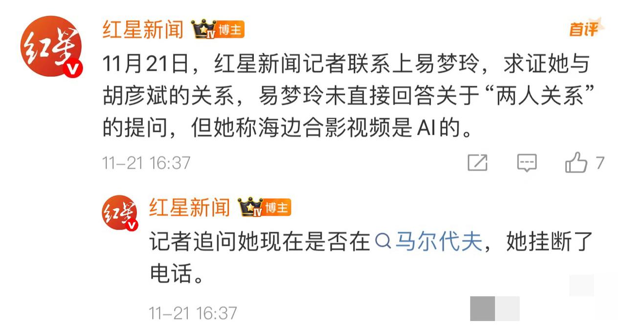 易梦玲回应海边与胡彦斌接吻视频是ai的。 今天网上疯传胡彦斌与易梦玲牵手和接吻视频。 不禁感慨俩人怎么如此高调示爱。 原来这都是假的,ai出来的。 记者就此电话联系了易梦玲,她除了说视频是ai的外,其它一律不予回复