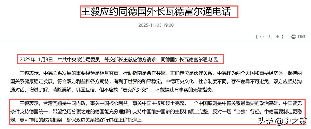 这次明显没给德国留面子,王毅正告德国外长,特意提了30多年前的一段往事! 前段时间取消访华计划的德国外长,在3号的时候和王毅外长进行了通话。从外交部网站的消息来看,这次明显没给德国留面子。为什么这么说? 一是公告的标题——王毅应约同德国外长瓦德富尔通电。“应约”二字表明,这通电话是由德国主动发起的。实际上,王毅外长经常“应约”同外国高层通话。但是,即使是应外国邀请,也很少会在标题上就点名“应约”,通常是在公告第一段表示应约通话。 比如,10月29号,王毅外长就应约同阿尔及利亚外长阿塔夫通话,这通公告的标题就是——王毅同阿尔及利亚外长阿塔夫通电话。然后在公告的第一句,才点出王毅外长应约通话。而像德国这次直接把应约写进标题的,不能说一次没有过,翻了一下今年的记录,最起码这还是第一次。 二是公告的开头,11月3日……王毅应德方请求,同德国外长瓦德富尔通电话。还是那句话,翻了一下今年的记录,这样的写法也是第一次。一般情况下,应约通话的开头会这么写:外交部长王毅应约同某某某通话。 可这次不一样,开头直接写道应德方“请求”。如果说应约是“邀约、邀请”的话,那么“请求”就是把姿态放到低的不能再低了。 从这短短的两个点,就反应出来一件事:德国知道错了,也知道着急了。不过话说回来,德国外长为何会取消原定于10月底的访华行程?按照德媒的说法,中方只确定了瓦德富尔和王毅的会晤,无法确认任何其他安排,因此暂时取消访华行程。 从德媒的消息来看,其实透露了两点。一是为何想见更多人?这是因为当前中欧围绕稀土管制等经贸问题存在交流需求的背景下,德方期待通过更多高层对话发挥积极作用。所以,从德国的角度来看,瓦德富尔的确想见到更多人。 二是为何只能见到王毅外长?瓦德富尔应该是心知肚明。自今年5月份上台以来,瓦德富尔一直保持强硬对华立场,公开批评了中国对俄政策、在印太地区“咄咄逼人”、稀土和芯片出口管制措施等。 尤其关键的是,瓦德富尔还在台海问题上说三道四。今年8月份,瓦德富尔在访问日本和印尼时,公开要求北京不要改变台海现状。而在访华前,瓦德富尔仍然不知收敛,10月23号接受采访时表示:“台海要是打起来了,将严重影响世界经济贸易”。并称“必须要避免暴力改变现状。” 所以,在11月3号的通话中,王毅外长正告德国外长,“台湾问题是中国内政,事关中国核心利益,事关中国主权和领土完整。一个中国原则是中德关系最重要的政治基础。” 同时,王毅外长还提了30多年前的一件事,他说,“中国曾无条件支持德国统一,希望经历分裂之痛的德国能充分理解和支持中国维护国家的主权和领土完整,反对一切‘台独’行径。” 30多年前,德国统一时,中国是如何表态的?1990年9月26日,时任外长在联大会议期间会晤时任德国外长根舍时表示,“中国一贯支持德国统一,从不干涉欧洲事务、德国统一和其他国家的内部事务”。德国统一当天,即1990年10月3日,中国就立刻表示承认统一后的德国主权。 所以,中国当初无条件支持德国统一。现如今,德国也应该无条件支持中国统一。作为外长,瓦德富尔应该要谨言慎行。
