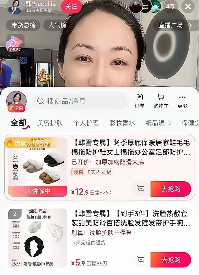 韩雪也来抢9块9的生意了!直播卖5块9洗脸巾、12块9棉拖鞋,网友惊掉下巴:这还是那个“大院”里长大的韩雪吗? 曾自称家里有司机警卫员的她,如今在直播间接地气带货,销量直冲数千件。更巧的是,她刚退出与老公合资公司,名下只剩一家关联企业。 从春晚歌手到平价主播,这转型你看懂了吗? 韩雪直播带货