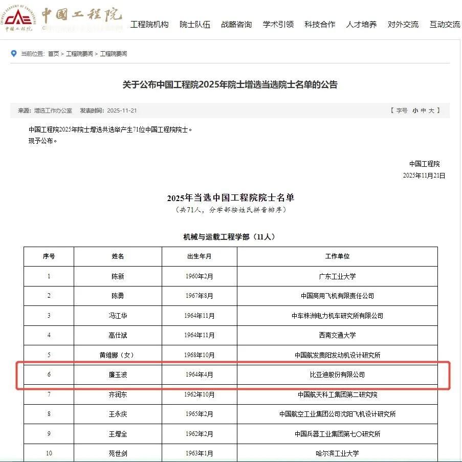 廉玉波当选中国工程院院士,恭喜!这不仅是个人荣誉,也不仅是比亚迪的荣誉,更是中国汽车产业的荣誉。