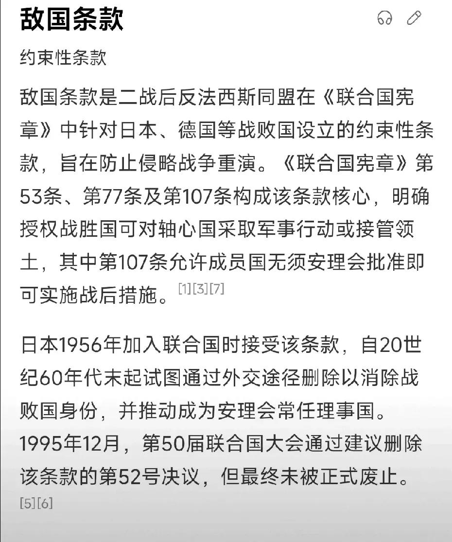 最新,中国驻日大使馆今天(11月21日)发文写道:“《联合国宪章》专门设立敌国条款,规定德意日等法西斯icon或军国主义icon国家的任何一国有再次实施侵略政策的任何步骤,中法苏英美等联合国创始成员国有权对其直接实施军事行动,无须安理会授权。 中国驻日使馆直接亮杀招,重提《联合国宪章》敌国条款,字字戳中日本痛处:只要德意日等国再有军国主义复活、侵略苗头,中法苏英美等创始国可直接采取军事行动,无需安理会授权,这力度比十次抗议都管用。 这已是使馆针对高市内阁的第8次发声,此前提东京审判定战犯,如今锚定敌国条款,再加上四大战区先后表态,信号再明确不过。 高市早苗炒作“存亡危机事态”,本质就是军国主义抬头,早已触碰条款红线,大阪总领事先抛条款是预警,使馆官方发声就是法理定调,既占道义高地,更有规则支撑,连二战后驻军约定都有历史依据,根本没给日方模糊空间。 日方想逃避战败国责任、试探红线,终究绕不开宪章约束,底线面前没有讨价还价余地。 你觉得高市内阁会收敛挑衅,还是继续硬刚?