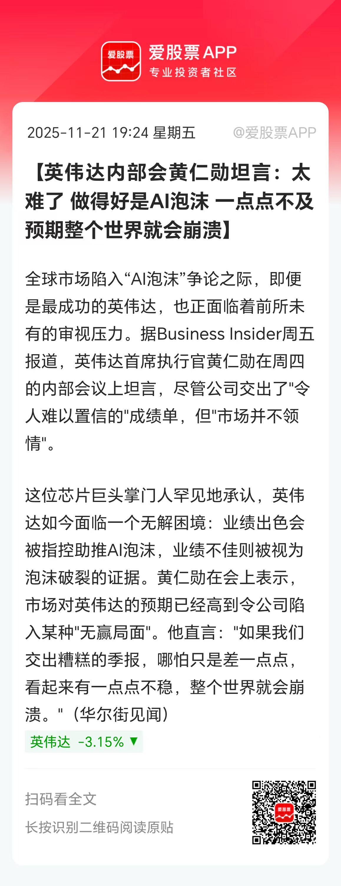 昨天英伟达业绩炸裂,但股价从+开盘5%到收盘-3%,把黄仁勋搞的一脸懵逼! 市场为啥对英伟达不领情?因为“AI泡沫”论占主流,你一个卖铲子的公司再牛逼,如果AI应用起不来,最终依然会是巨大的泡沫。 所以,现在英伟达左右为难,业绩太好,市场说这是助推泡沫;业绩不好,市场说这就是泡沫....!本质上还是涨的太多了,英伟达一度5万亿美元的市值,2020到现在涨了40倍。等到泡沫破裂,就会知道5万亿是个多么惊人的数字了。