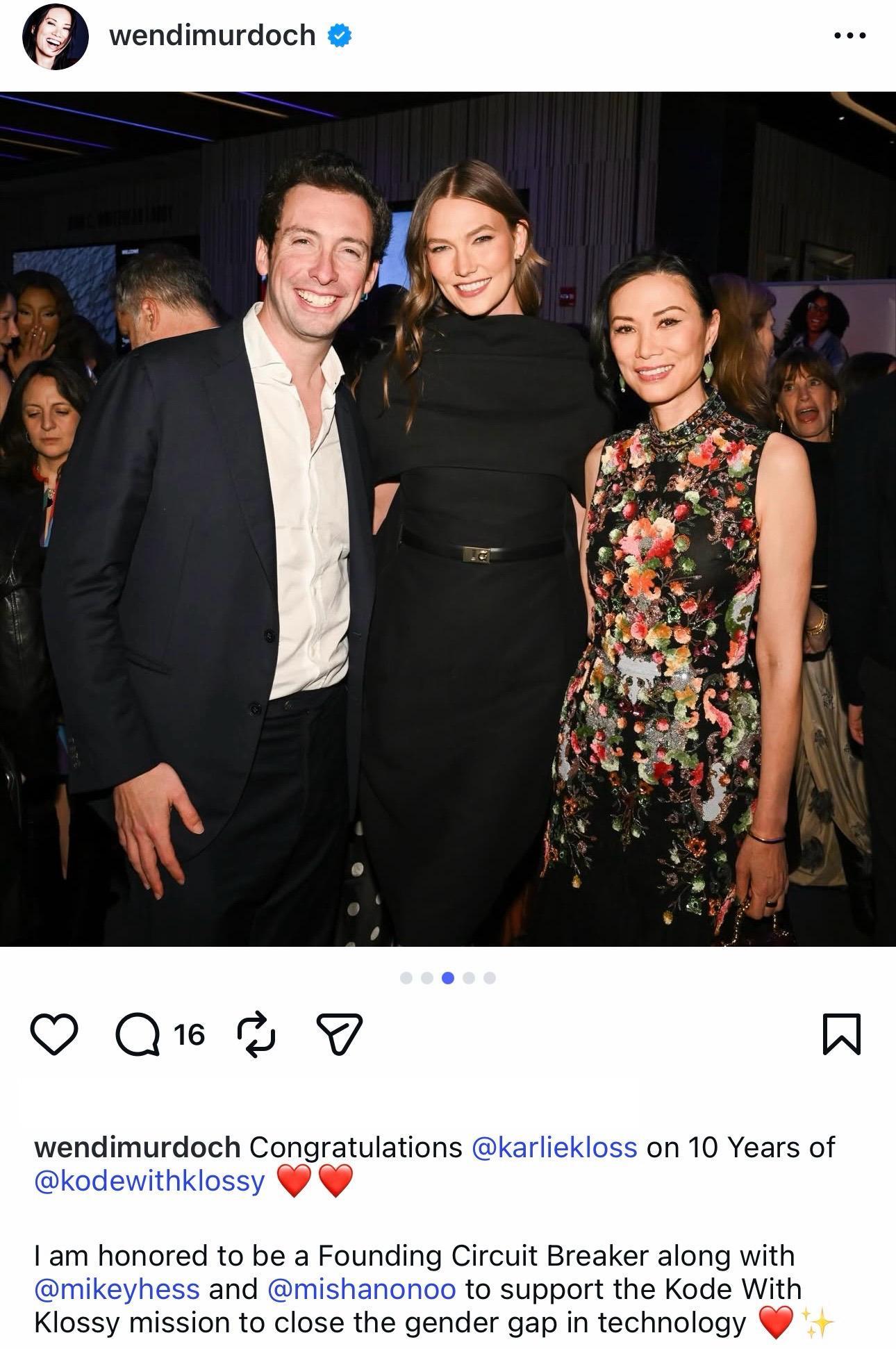 邓文迪发文恭喜Karlie Kloss创办的Kode with Klossy走过10周年👇(附上图三:她跟Karlie Kloss、达莎上个月在一场文化晚宴的合照)