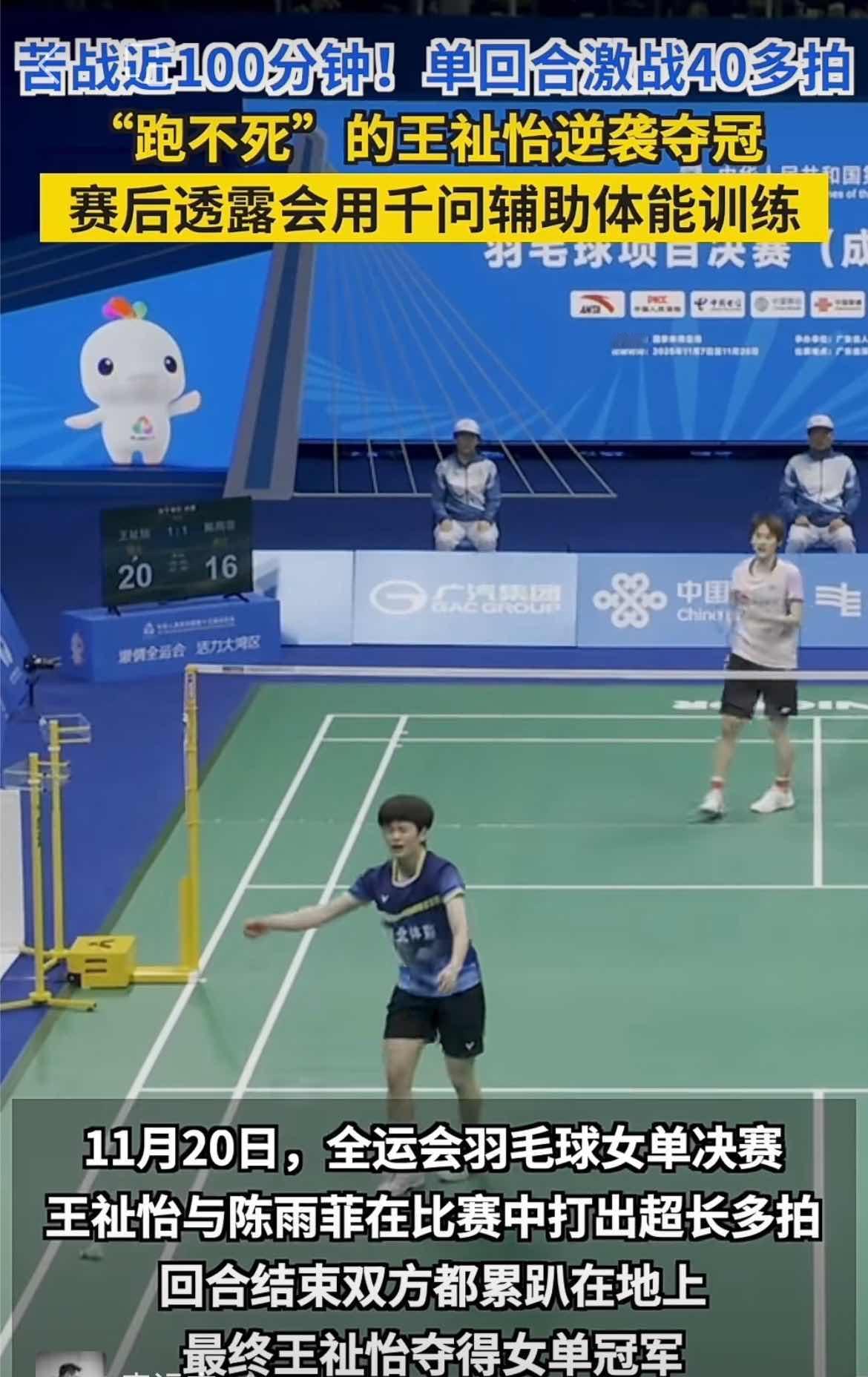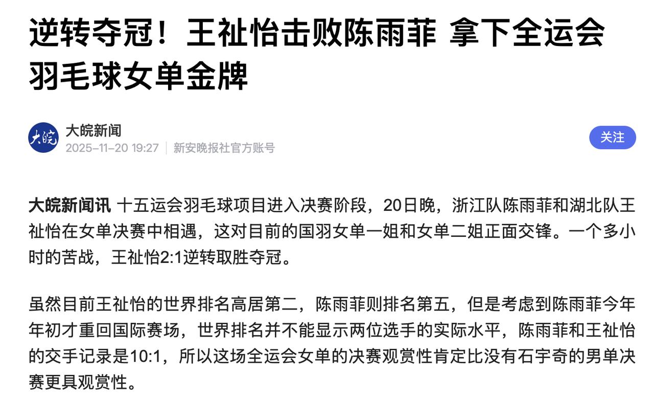 谁能想到,这位曾被质疑、曾遭遇低谷的姑娘,会在全运会的赛场上逆风翻盘! 在激战40多拍后,王祉怡打出中国女单最硬气的一声吼!金牌不仅属于她,更属于所有相信中国羽毛球不会倒下、相信国羽精神永不磨灭的人。 在赛后采访中,王祉怡大方分享了自己的训练方法,“平时会用千问辅助体能训练”,要知道世界羽坛向来是中国与强敌胶着之地,从体能、力量到抗压能力,每一项都至关重要。而如今中国选手背后站着的,正是不输海外的中国AI。 很多运动员都会用AI帮助提升训练效率,美国职业体育更是早就用上了AI辅助训练,比如NBA球队会用AI分析球员移动、速度、投篮和防守,来优化战术和制定训练计划。 而王祉怡使用的这个千问APP,正是阿里旗下产品,背后搭载的是先进的千问系列模型,就拿千问3推理模型来说,有着比肩Gemini-2.5 pro、o4-mini的性能表现。 也正是靠着强大的推理和分析能力,千问APP才能够根据王祉怡的日常训练表现和记录,一次次优化体能训练策略和战术,让她的体能在这近两个小时的比赛中不掉链子,成就了这次的逆袭夺冠。 体育+科技的深度融合,让这一刻的意义变得不同,当王祉怡用实力证明,中国运动员能在竞技场上勇攀高峰;千问则用技术证明,中国 AI 同样处于世界前列。 让我们为她欢呼,为千问喝彩,这不仅是一次体育胜利,更是科技与民族信心的双重绽放,是中国新时代力量之美!