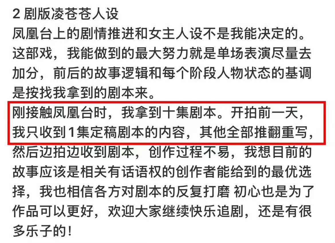 彭小苒发文坦言《凤凰台上》开拍前仅收到1集定稿剧本,后续内容都是边拍边收剧本。面对创作过程中的挑战,她展现出专业演员的素养,认为这是制作团队反复打磨后的最优选择。这种在创作过程中保持信任与配合的态度,展现了她的专业精神。