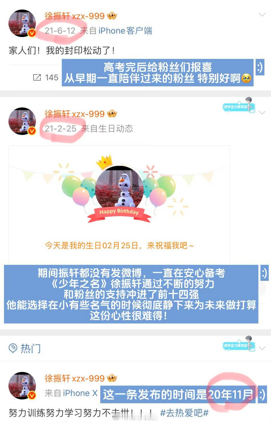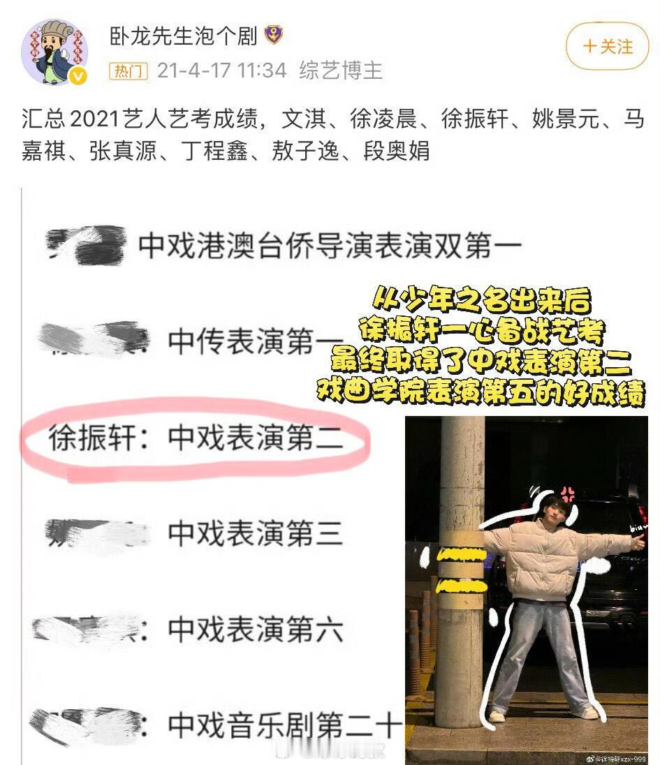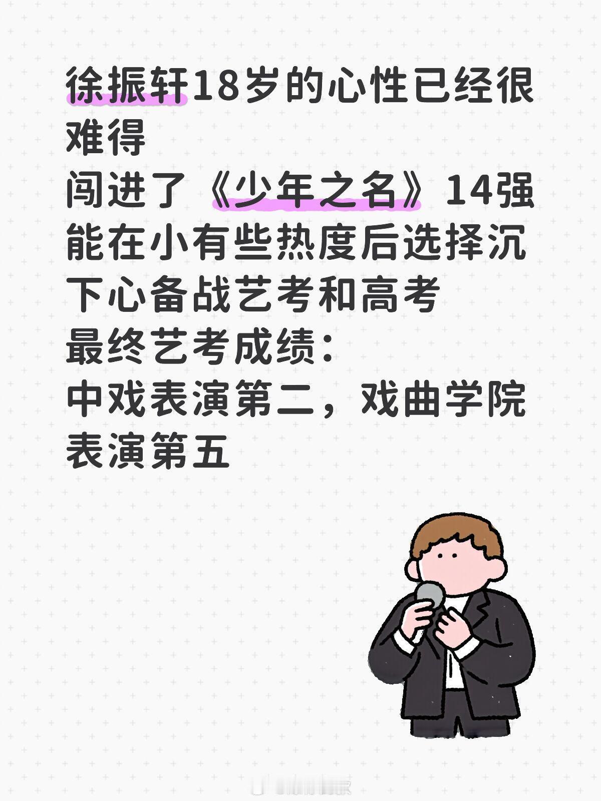 考古帖|关于徐振轩艺考高考的二三事徐振轩的18岁,是从一场“战役”打到了另一场“战役”。没有任何唱跳基础的他,拥有一腔热忱和进取恒心,压力和动力的鞭策下,他在《少年之名》的舞台上不负期许。2020年8月,节目结束后,他立刻着手准备艺考。2020年9月至2021年7月,直至尘埃落定,他重新出发。我想,节目刚结束时,有些热度的小徐同学遇见过一些工作机遇,但他有为长期发展进行深思熟虑。不贪图眼前,而着眼于将来。很难不为他这份心性所动容,清楚自己想要什么,想做什么,并为此付出努力和时问。谢谢你成为了演员,你所饰演的角色是你不同阶段成长的体现。
