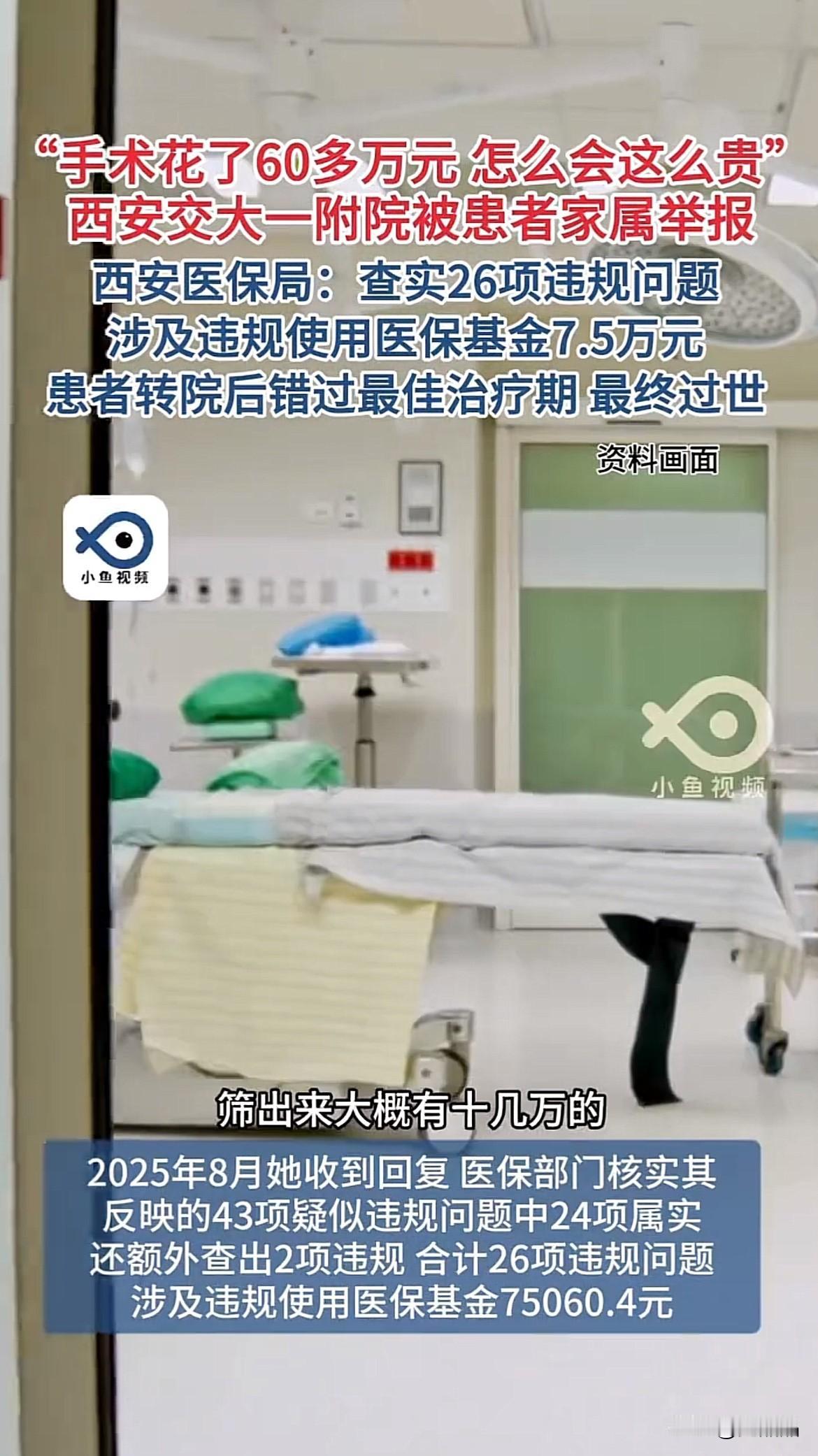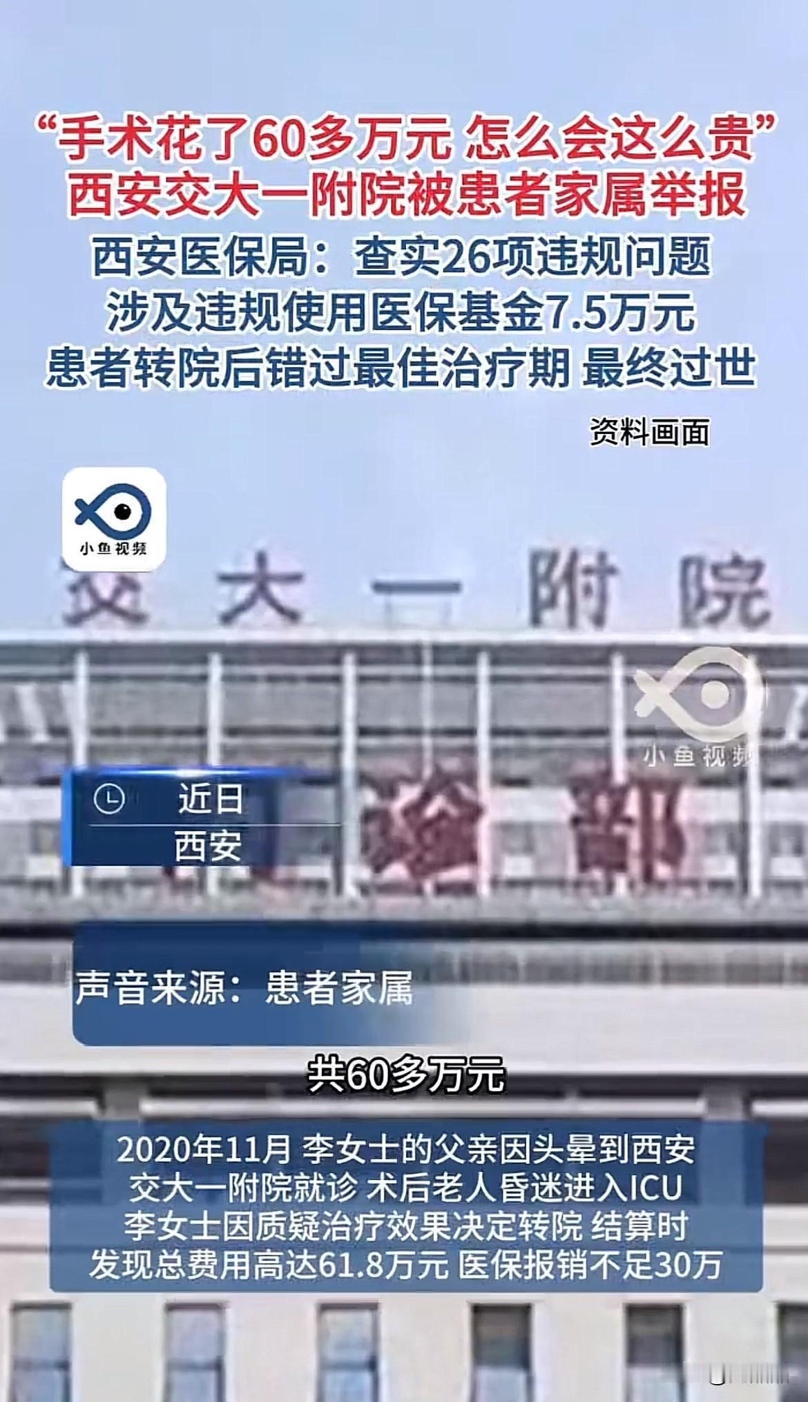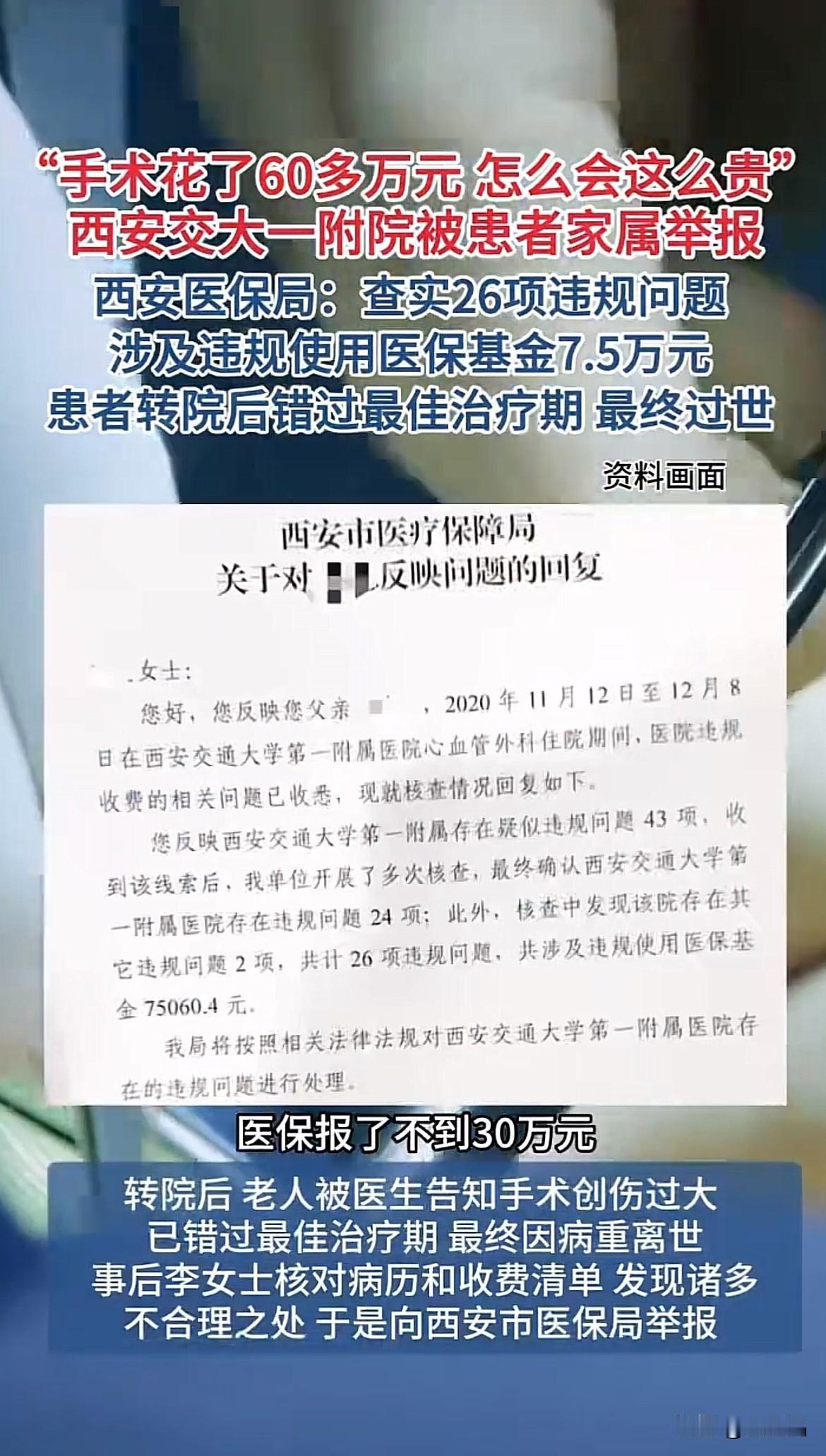 手术花了60多万被告知病情稳定,结果人没了,患者家属怒扒医疗清单举报。 李女士父亲2020年因头晕入院,被诊断为心脏问题,出于对三甲医院的信任,李女士马上同意了手术。术后老人昏迷进入ICU,李女士质疑疗效要转院,结果转院医生告知手术创伤太大,已经错过最佳治疗期,术后46天老人离世。 李女士越想越不对劲,翻看医疗清单一探究竟,不看不知道,一看吓一跳。“父亲做的是心脏手术,怎么有34次会阴清洗?”28万自费的心脏瓣膜没有经过家属同意签字就使用、6000多的纱布、5700元的缝合线…… 于是李女士向西安医保局举报43项疑似违规项,医保局查证26项违规使用医保属实,违规使用医保基金高达7.5万。 李女士的较真扒开了这家医院牟取暴利的遮羞布,医院是公益医疗机构,不是黑心商人获取利益的地方,超量开药、乱收费、过度医疗违背医生救死扶伤的初心,透支老百姓对医院的信任,更是浪费医保基金。 医保基金是每位缴费者共同的钱,是老百姓应对大病的救命钱,医院竟把牟利的黑手伸向医保基金,必须严查!