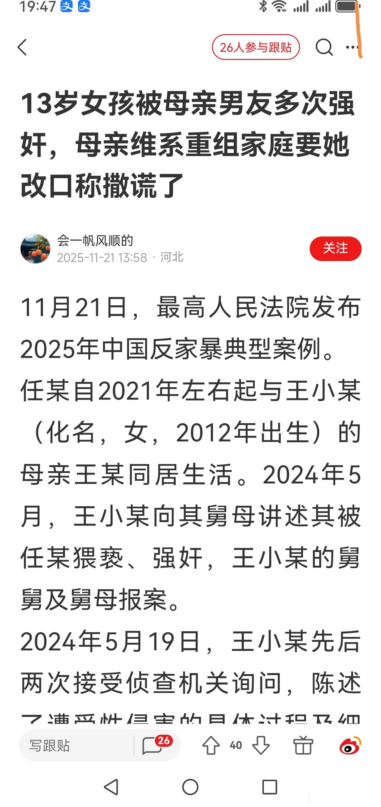 这个妈妈也不是一个好东西。自己的13岁女儿被自己的“男友”任某多次猥亵、强奸,做为女人不可能一点不知道的。正是这妈妈的纵容,才让这个男人胆大包大。没想到,舅舅及舅母报案后,这个“可恶的女人”居然欲维系重组家庭,让女儿改口称“之前撒谎”。那个男人很可恨,这女人更可恶,也应该被处以刑法!!