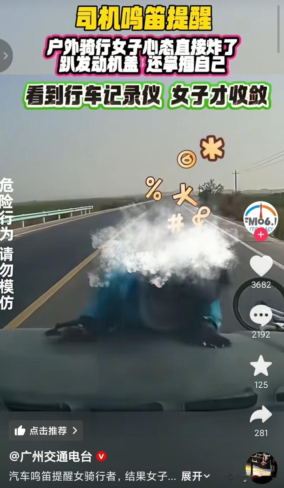 我都看得一脸懵,她为什么要这样做? 一名户外骑行的女子挡住了汽车的路,汽车只是鸣笛提醒她让路,她把车自行车一丢,趴到汽车的引擎盖上就捶,还扇自己的巴掌。 汽车也没有不礼貌行为,只鸣了一次笛,在提醒她车上有行车记录仪之后,她才收敛,同行的男子还立马把她拉开,一直在安抚她的情绪。 有网友说可能骑得太久了,目的地还很远,骑不动了,心里不舒服,那也不能拿自己撒气,看着挺吓人的。