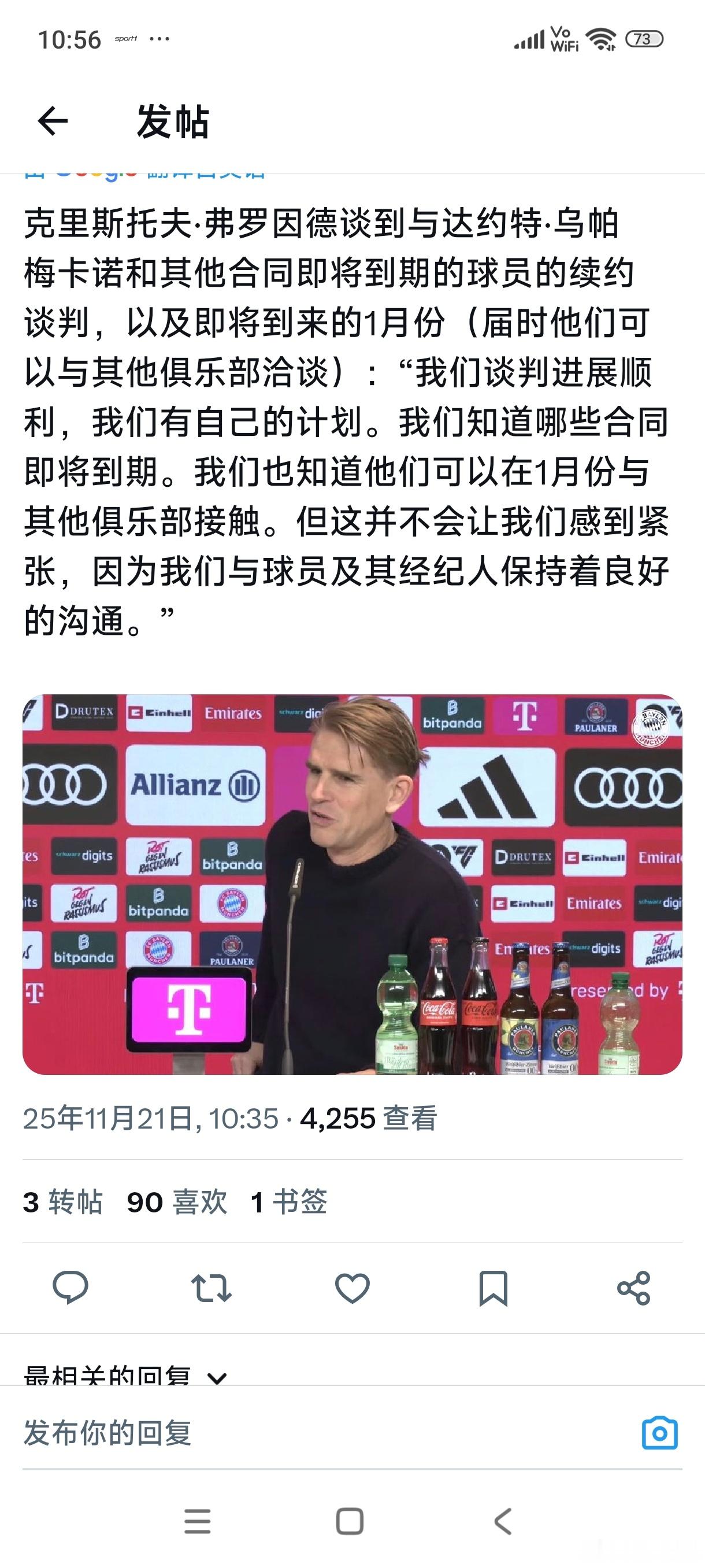 [弗洛因德谈续约进展]弗洛因德表示拜仁清楚目前到期合同和续约期限的情况,正在进行谈判。