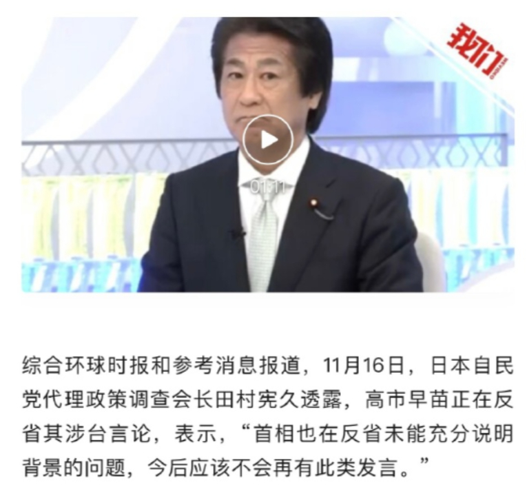 1月16日,日本自民党人士透露,高市早苗在反省其言论!当天,自民党代理政策调查会长田村宪久表示,高市早苗,正在对她近期涉台言论进行“反省”。田村宪久在回应主持人提问时明确指出:“高市本人正在认真反思自己的发言方式。今后应不会再有此类发言。”高市早苗此前的涉台言论具体指什么?回溯至2024年12月下旬,她在一次党内研讨会上称“台湾有事就是日本有事”,并主张“应考虑在台海局势紧张时派遣自卫队参与协防”。此言一出,立即引发中国外交部强烈回应,同时也在日本国内激起争议。根据日本共同社当时的民调,约58%的受访者认为此类表态“过于激进”,可能损害日中关系;仅有29%支持其立场。现场另一位在野党本庄知史则指出,高市早苗“对安全保障相关法律的理解不够充分”。而且对相关议题的敏感程度估计十分不足。此次田村宪久的表态,实际上标志着自民党高层开始对高市进行“软性约束”。值得注意的是,田村本人属于党内宏池会(岸田派)核心成员,其发言通常代表首相官邸立场。而“今后应该不会再有此类发言”的措辞,说明高市早苗受到的压力很大。但是,如果这样的声明不是来自高市早苗,以及相关言论不会撤回的话,那就说明其毫无诚意。这件事情上,归根结底日本人不反思是自己的根本认识出了问题。如果反省不深刻,未来还会有类似事情发生。