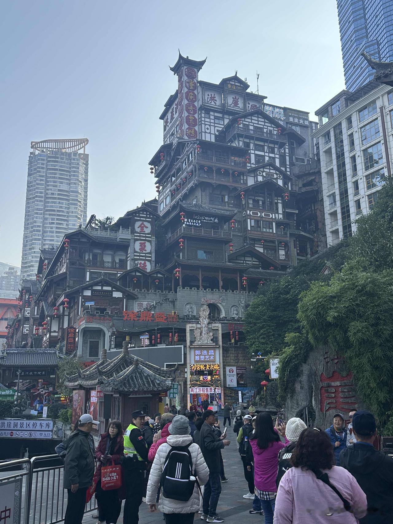 三峡游轮游日记|第六天:重庆一日游,打卡6景点 游轮在凌晨停靠重庆朝天门6号码头。早上7点多我们吃早饭,8点退房离船登岸,没想到从朝天门码头上岸需爬几十级台阶,没有电梯,而在秭归和奉节港码头都有还电梯或缆车。我们的行李箱都是棒棒军挑上去的,游轮上的物资也是靠棒棒军搬运,是不是为了不让棒棒军失业,码头才不实行现代化改造的? 经过几十级台阶上岸后,我们登上了大巴车,开始了重庆一日游。第一站是重庆市中心的解放碑,第二站是洪崖洞,洪崖洞还夜景漂亮,白天看差远了。第三站李子坝地铁站,看地铁穿房子。打卡了三个景点,就到中午了。 吃过午饭,继续打卡,下午第一站是磁器口古镇,第二站是渣滓洞,第三站是白公馆。参观完白公馆,我们就结束所有的游览活动,驱车前往重庆华辰国际大酒店。 晚上参加在酒店两江汇大厅举行的暂别晚宴。晚宴的菜很丰富,大家边吃边交流,并且穿插了一些即兴表演。 重庆一日游,除磁器口古镇外,我都是故地重游。没有想到这个时侯到处游人如织,几乎各个景点都是人山人海的。导游说这几天学校放秋假,许多家长带着孩子来旅游。