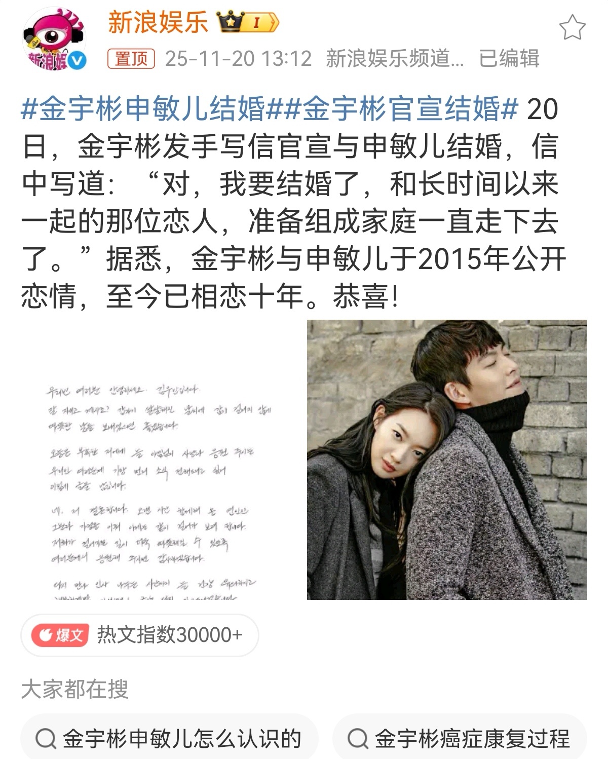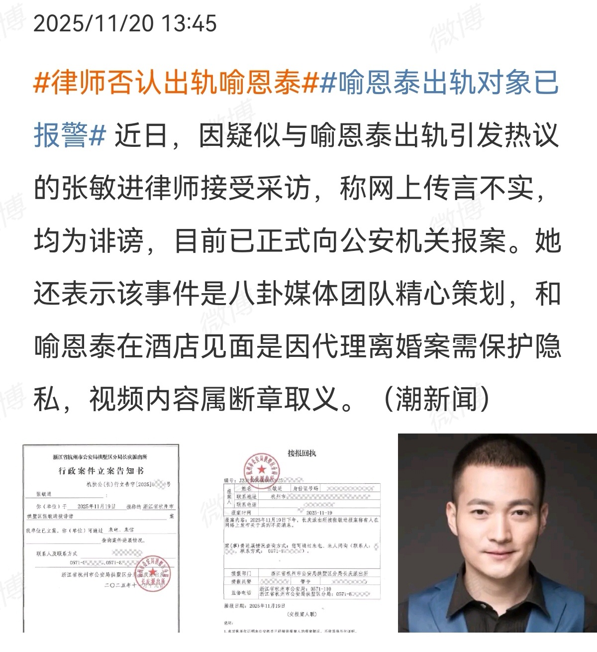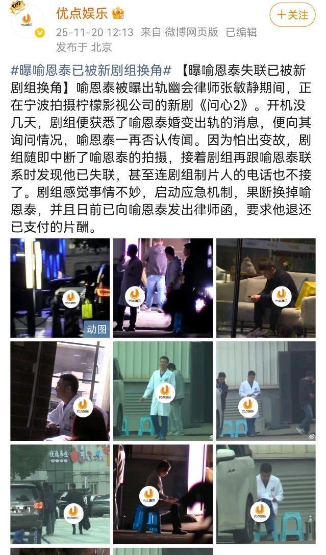 2025-11-21总结①狗仔开讽喻恩泰离婚声明 图1爆料喻恩泰被新剧换角,追回片酬 图2女律师否认出轨喻恩泰 图3爆料姚晨出轨的巨春雷怼喻恩泰,「你自己老婆什么样你不清楚」,还说要不是史林子善良,喻恩泰早就塌房了。图4卓伟回应喻恩泰和张敏进,说不存在跟拍数月,也不是精心策划。 图5②罗晋父亲去世 图6③电视剧中插广告实行 图7④杨宗纬否认恶毒邻说法 图8⑤金宇彬发手写信官宣与申敏儿结婚 图9⑥华策发声明,说有人冒用田栩宁给他谈商务 图10⑦网友拍到易梦玲跟胡彦斌接吻,红星新闻采访易说这视频是ai,假的,易的网红好友表示易以为红星新闻是私生,所以跟红星新闻瞎胡说了一通 图11撕❶虞书欣生日会,文旅局回应举报,合规审批,无取消计划 图12❷何不同舟渡,有瓜主爆料说剧没过会,杨洋粉开嘲檀健次,后瓜主说是原配置不过会,不是现演员,杨洋粉开撕说从没接过何不 图13❸原著作者谢楼南发文批评剧版改编,称原著“灵魂主角是萧焕”,剧版弱化其核心地位;并称“爱女”是为凌苍苍“配完美老公” 图14彭小苒回应剧像东宫,女主人设,原作者改编失望,强调“剧情推进非演员能决定” 图1519号