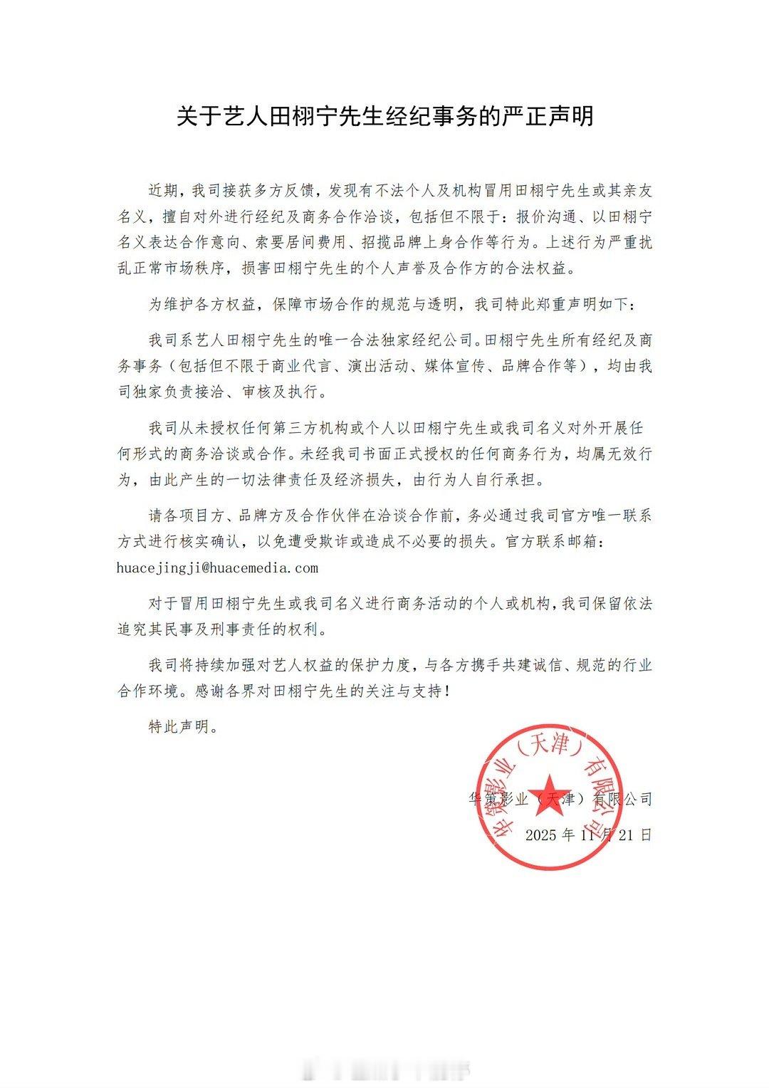 田栩宁公司发声明维权了,支持维权保护自己的合法权益